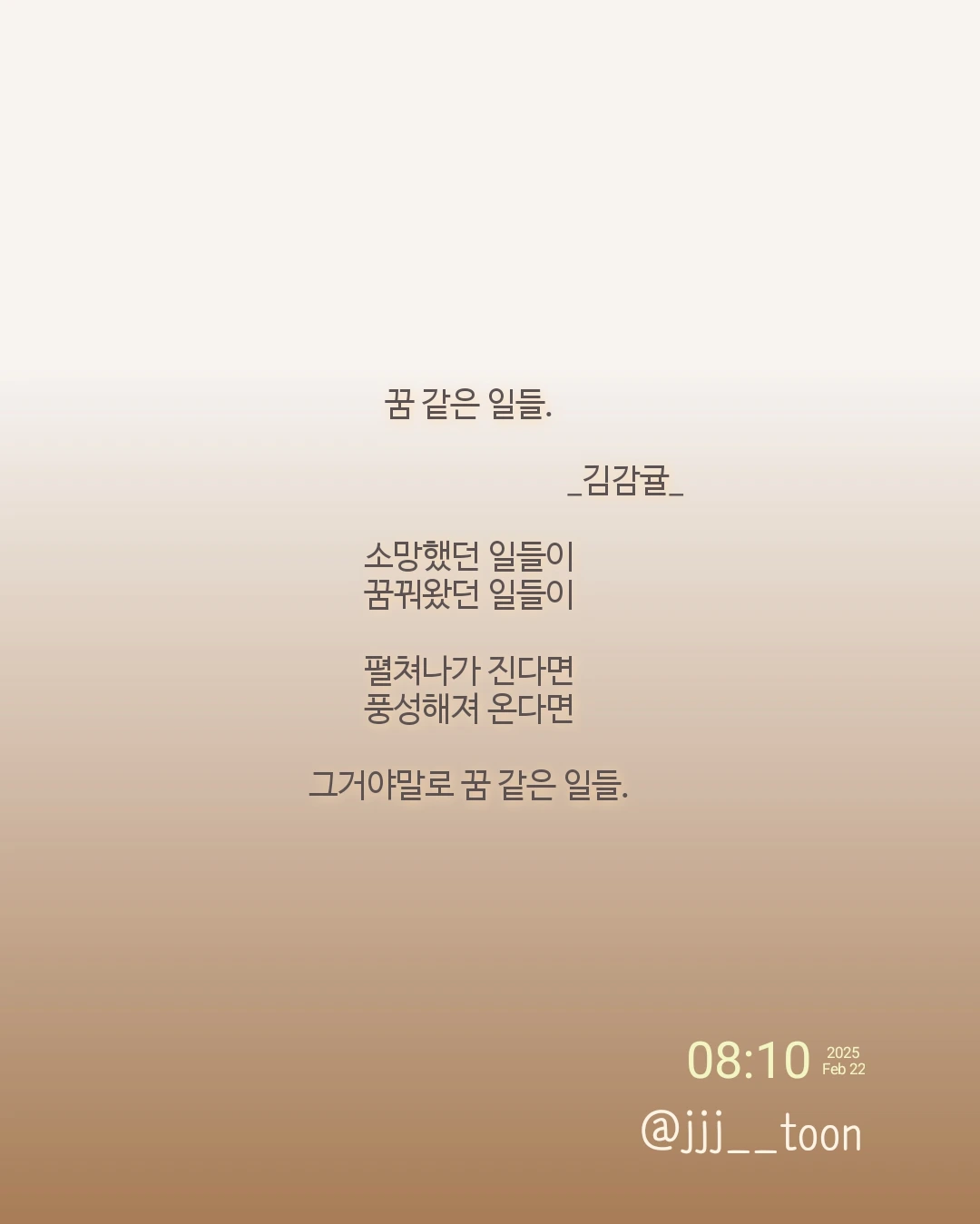 김감귤의 브런치입니다. 시, 짧은 글, 일기를 쓰기도 하며, 자유롭게 글을 쓰고 생각을 표현하는 활동을 좋아합니다. 개인 가치관이나 경험에 비춰 글을 읽을 수 있다고 생각합니다.