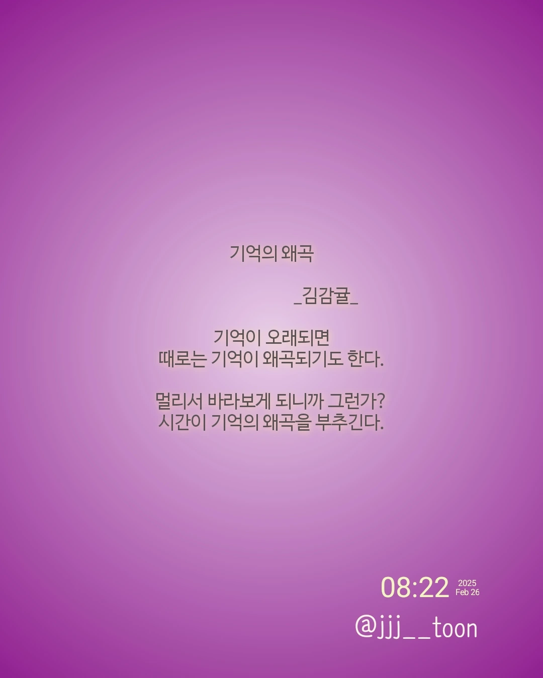 기억의 왜곡 _김감귤_기억이 오래되면때로는 기억이 왜곡되기도 한다.멀리서 바라보게 되니까 그런가?시간이 기억의 왜곡을 부추긴다.