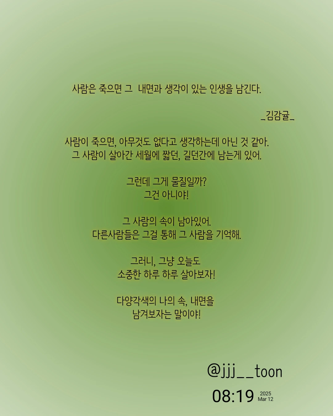 사람들이 죽는다는 것은 슬프지만, 그 죽음은 누구에게나 가까이에서 살고 있는 사실이라는 사실이지요. 그렇기 때문에 하루하루 삶을 소중히 여겨야 하는 마음을 가지고 살아가자는 의미로써 이렇게 시를 써봤습니다.