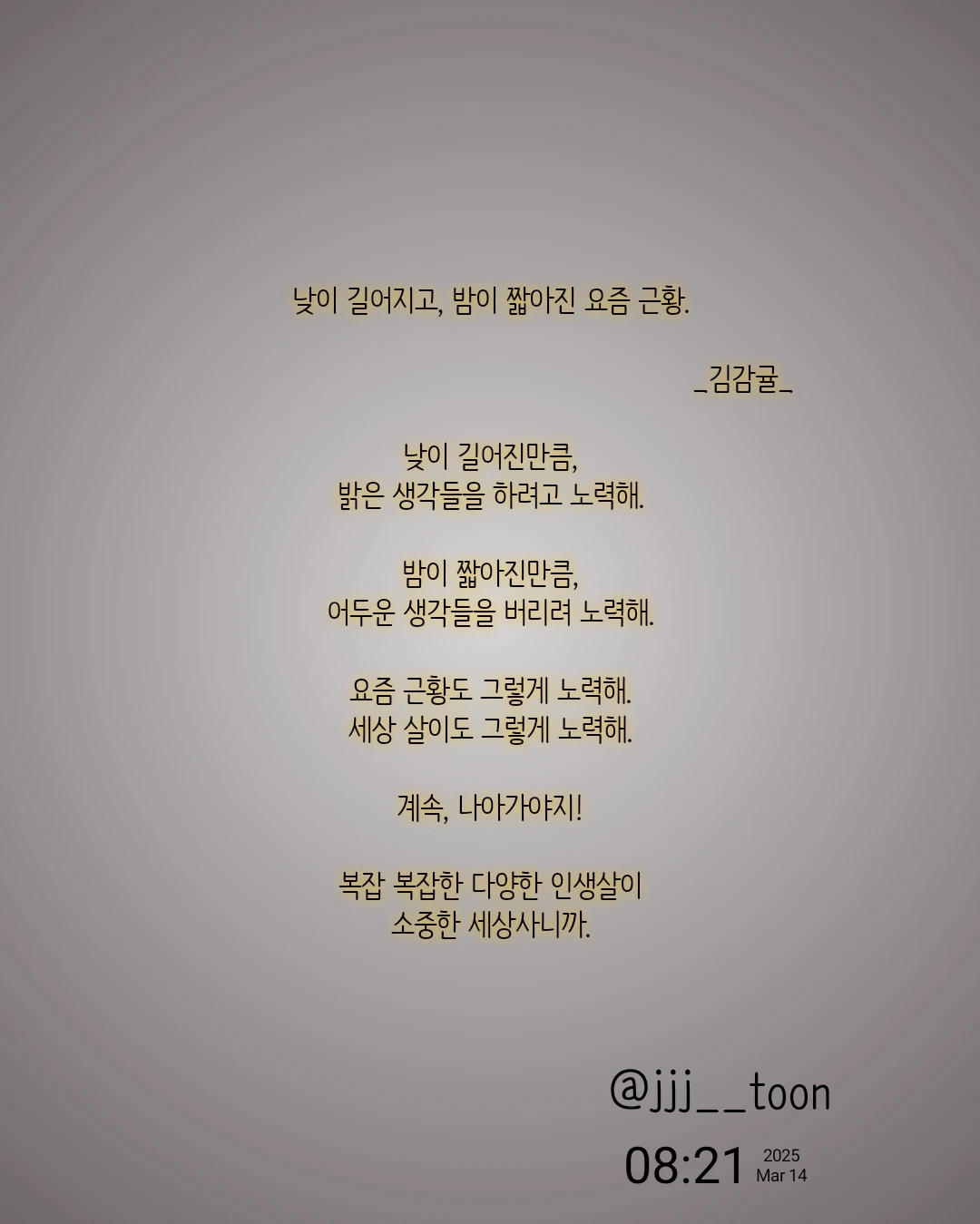 김감귤의 브런치입니다. 시, 짧은 글, 일기를 쓰기도 하며, 자유롭게 글을 쓰고 생각을 표현하는 활동을 좋아합니다. 개인 가치관이나 경험에 비춰 글을 읽을 수 있다고 생각합니다.