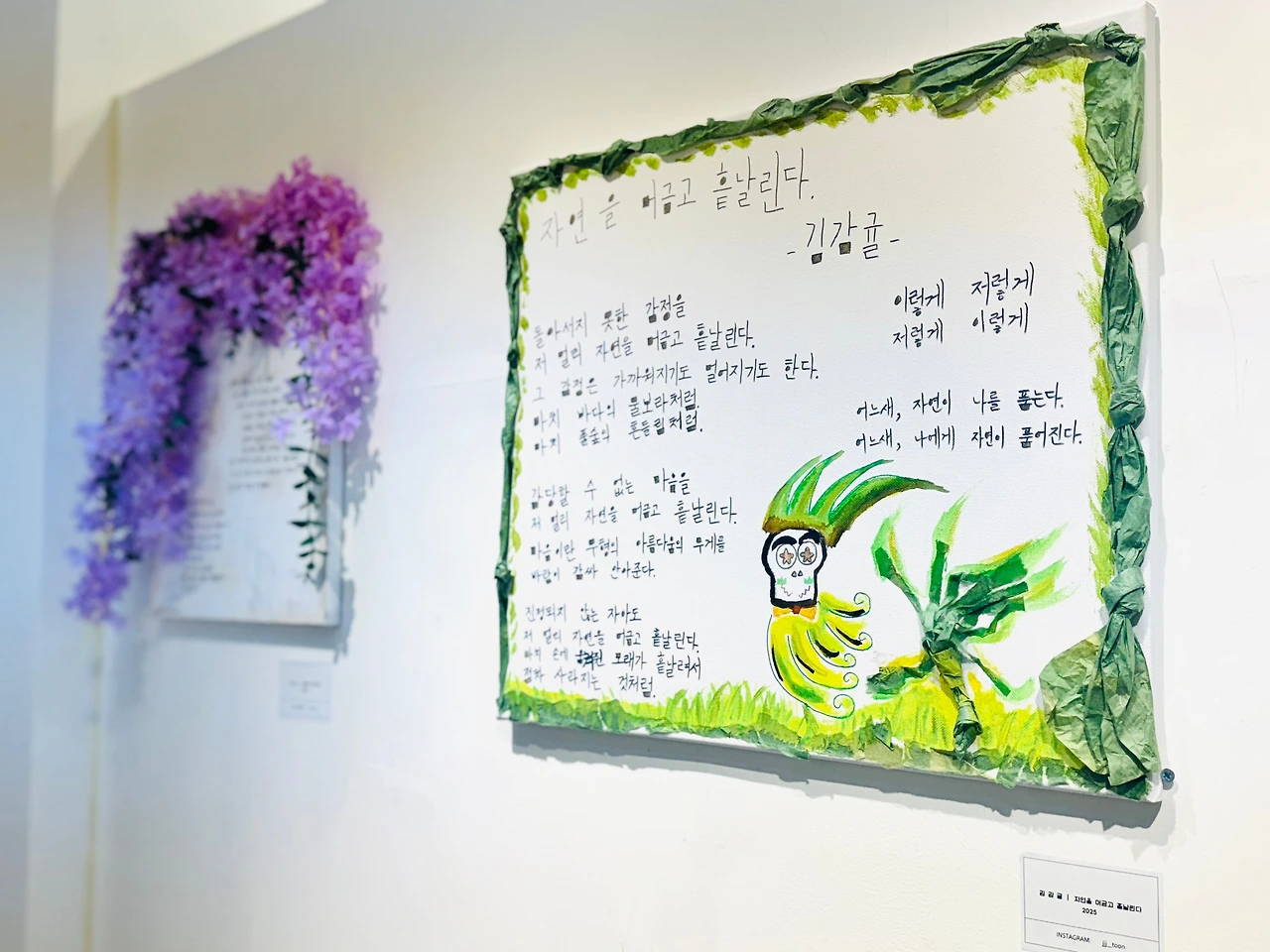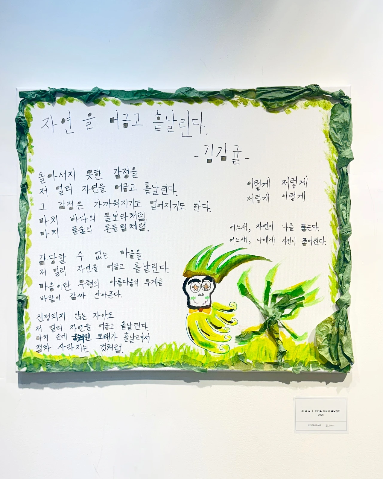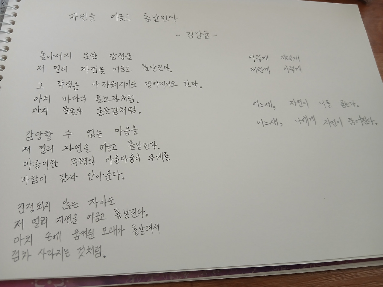 자연에게 부정적인 부분을 흩날리며, 내 마음을 천천히 풀어나가고 정화한다는 생각으로 시를 써 내려갔습니다. 세상에서 부정적이고, 아프고 힘들고 상처받은 마음들을 자연을 통해 보내본다는 관점입니다. 자연을 많이 접해서 친숙해지고 좋아지는 감정이 생기는 것처럼 안 좋은 감정들(부정적이고, 아프고 힘들고 상처받은 마음들)이 자연에게 털어놓음으로 인해서 어느샌가 자연스럽게 승화되며 치유된다는 시입니다.