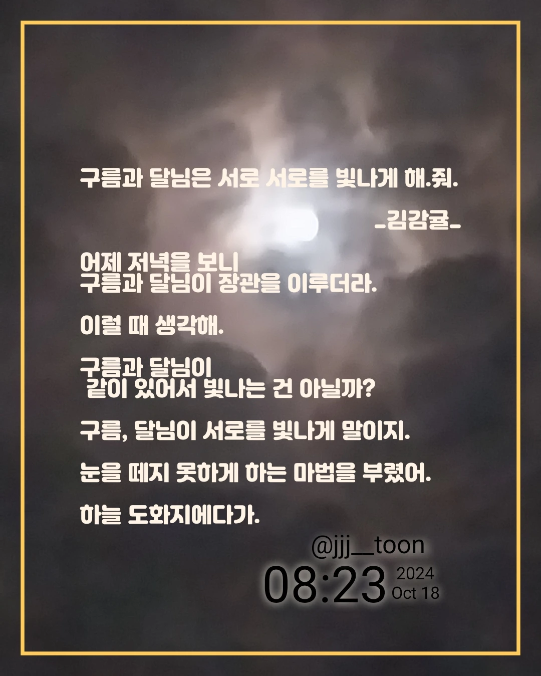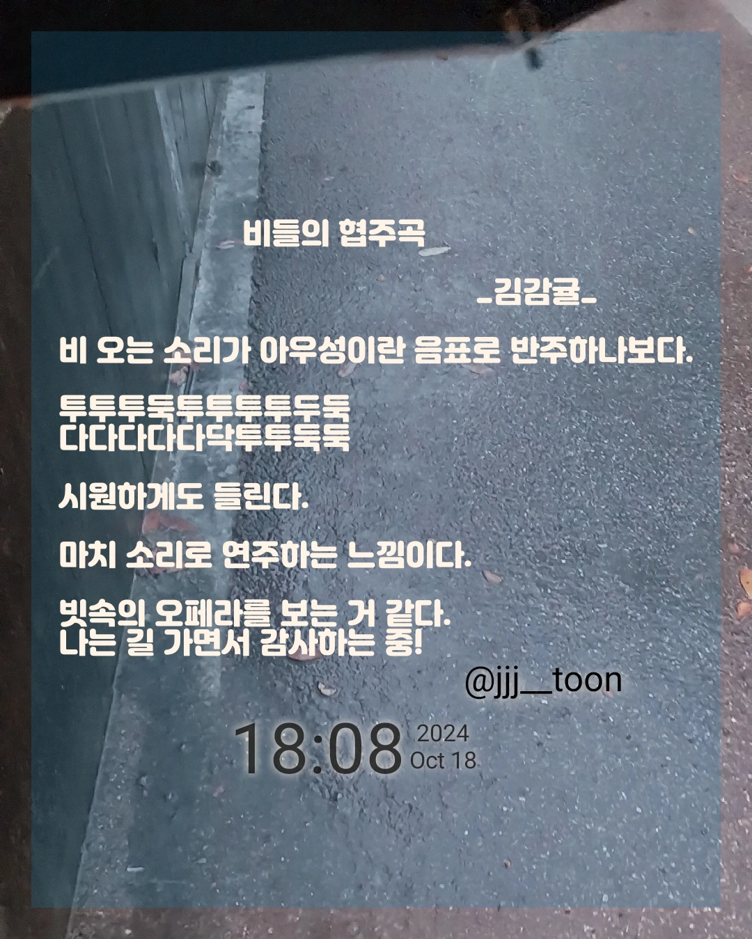김감귤의 브런치입니다. 시, 짧은 글, 일기를 쓰기도 하며, 자유롭게 글을 쓰고 생각을 표현하는 활동을 좋아합니다. 개인 가치관이나 경험에 비춰 글을 읽을 수 있다고 생각합니다.