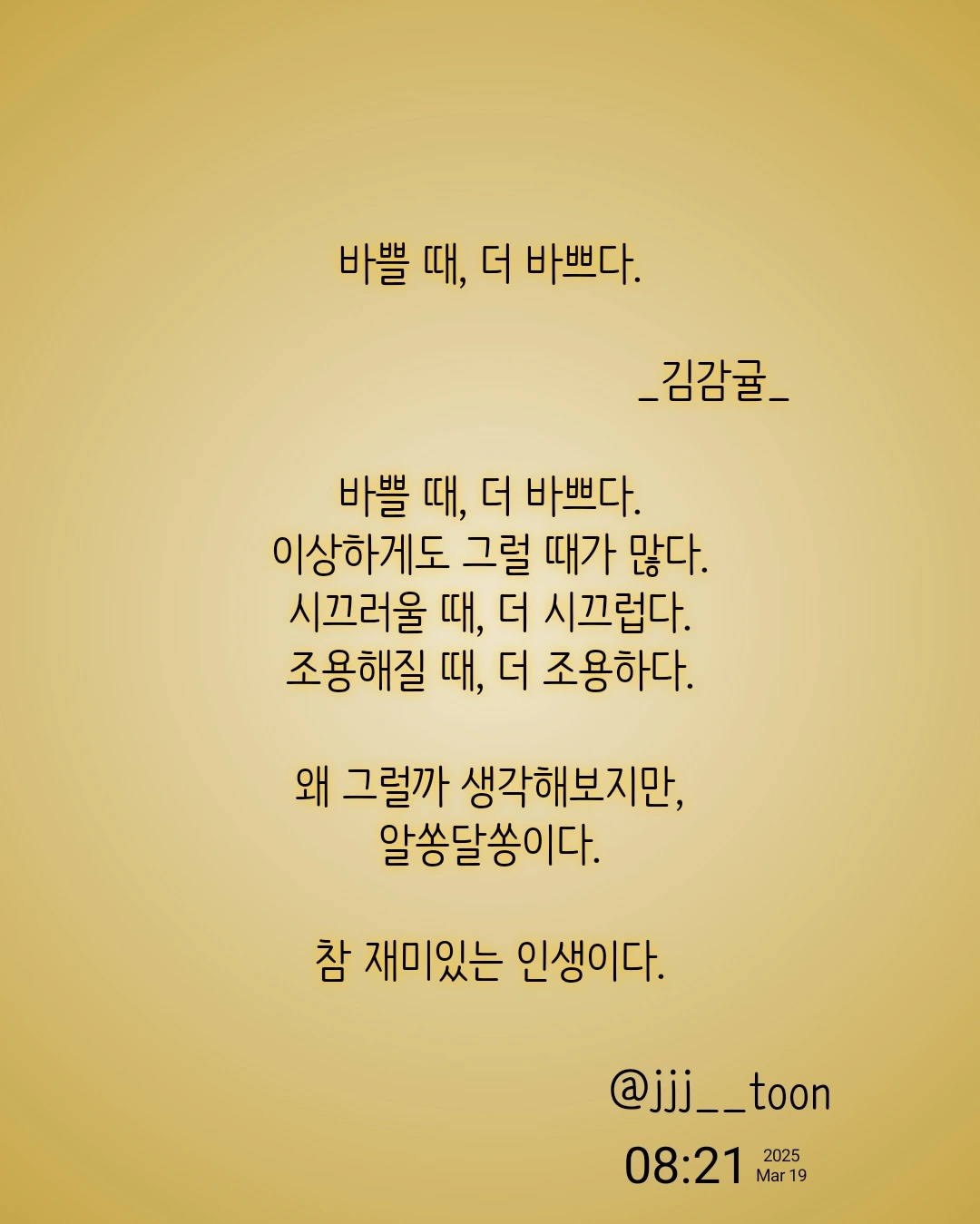 바쁠 때, 더 바쁘다. _김감귤_바쁠 때, 더 바쁘다.이상하게도 그럴 때가 많다.시끄러울 때, 더 시끄럽다.조용해질 때, 더 조용하다.왜 그럴까 생각해보지만,알쏭달쏭이다.참 재미있는 인생이다.