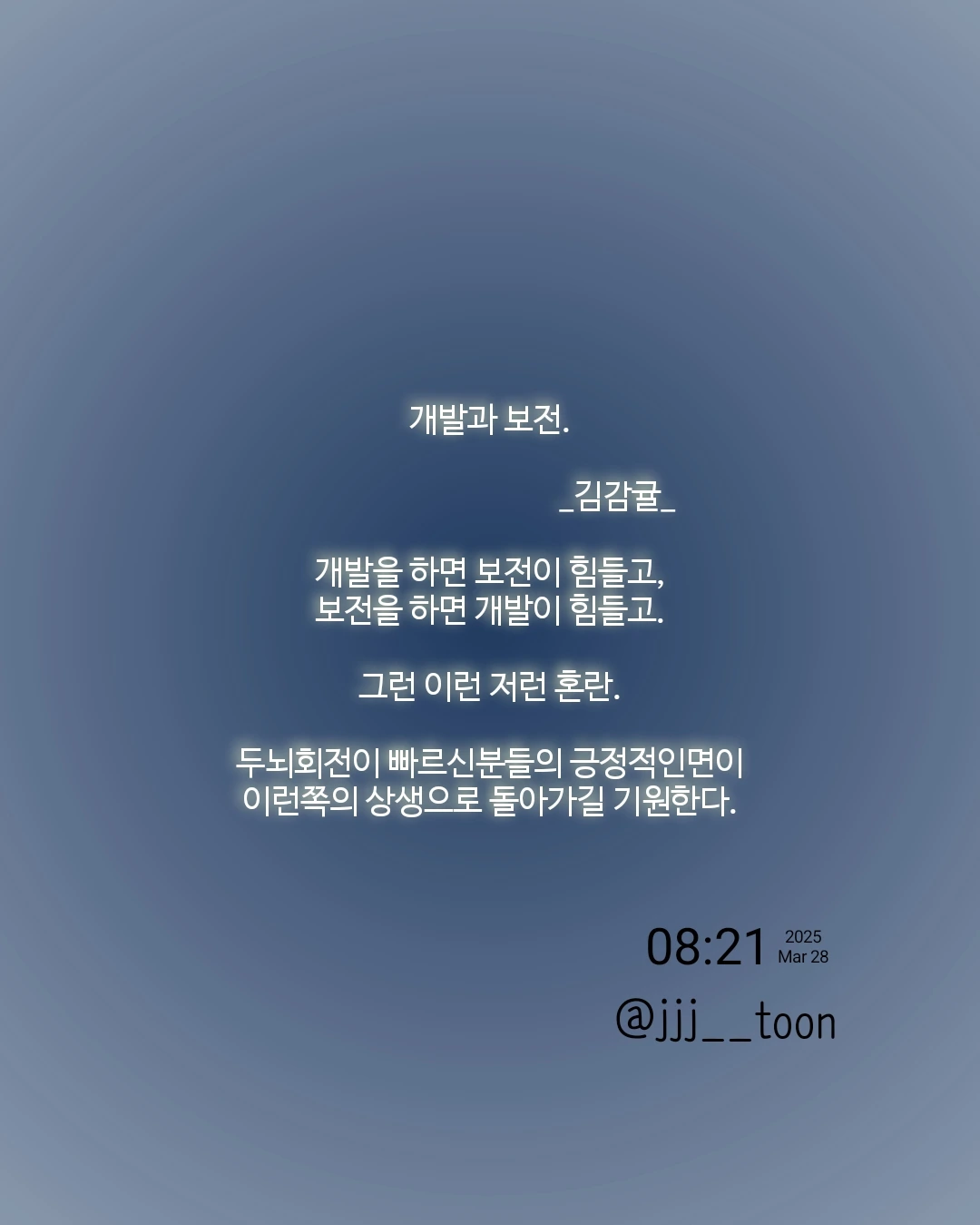 개발과 보전. _김감귤_개발을 하면 보전이 힘들고,보전을 하면 개발이 힘들고.그런 이런 저런 혼란.두뇌회전이 빠르신분들의 긍정적인면이이런쪽의 상생으로 돌아가길 기원한다.