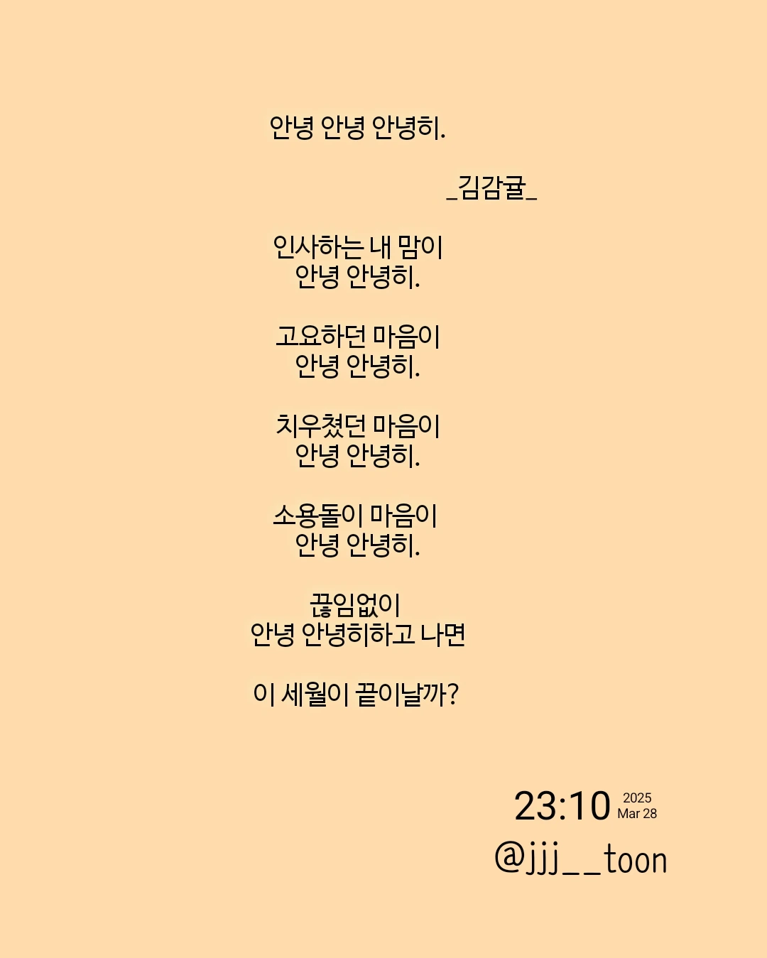 안녕 안녕 안녕히. _김감귤_인사하는 내 맘이안녕 안녕히.고요하던 마음이안녕 안녕히.치우쳤던 마음이안녕 안녕히.소용돌이 마음이 안녕 안녕히.끊임없이 안녕 안녕히하고 나면이 세월이 끝이날까?
