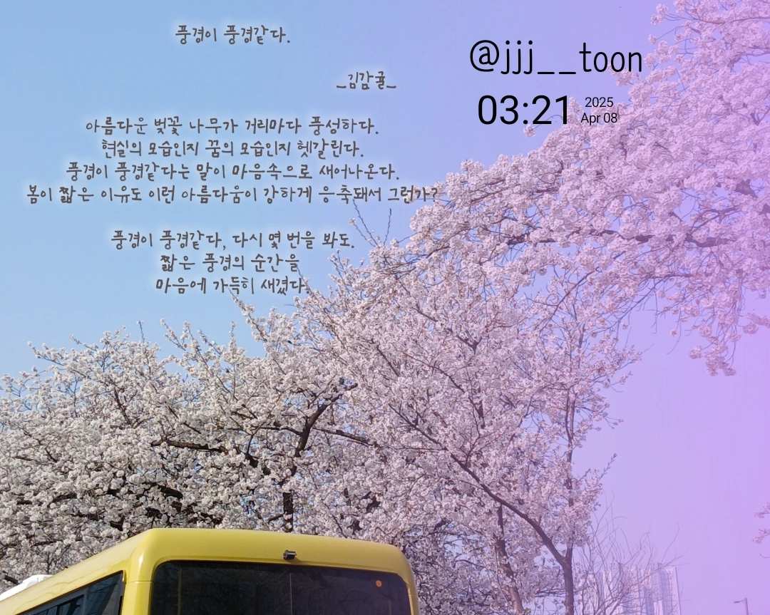 마음이 힘들 때 이런 풍경을 보면 위로가 되길 바라며 나의 시도 봄 풍경의 아름다움을 보며 위로를 받고 써봤다.