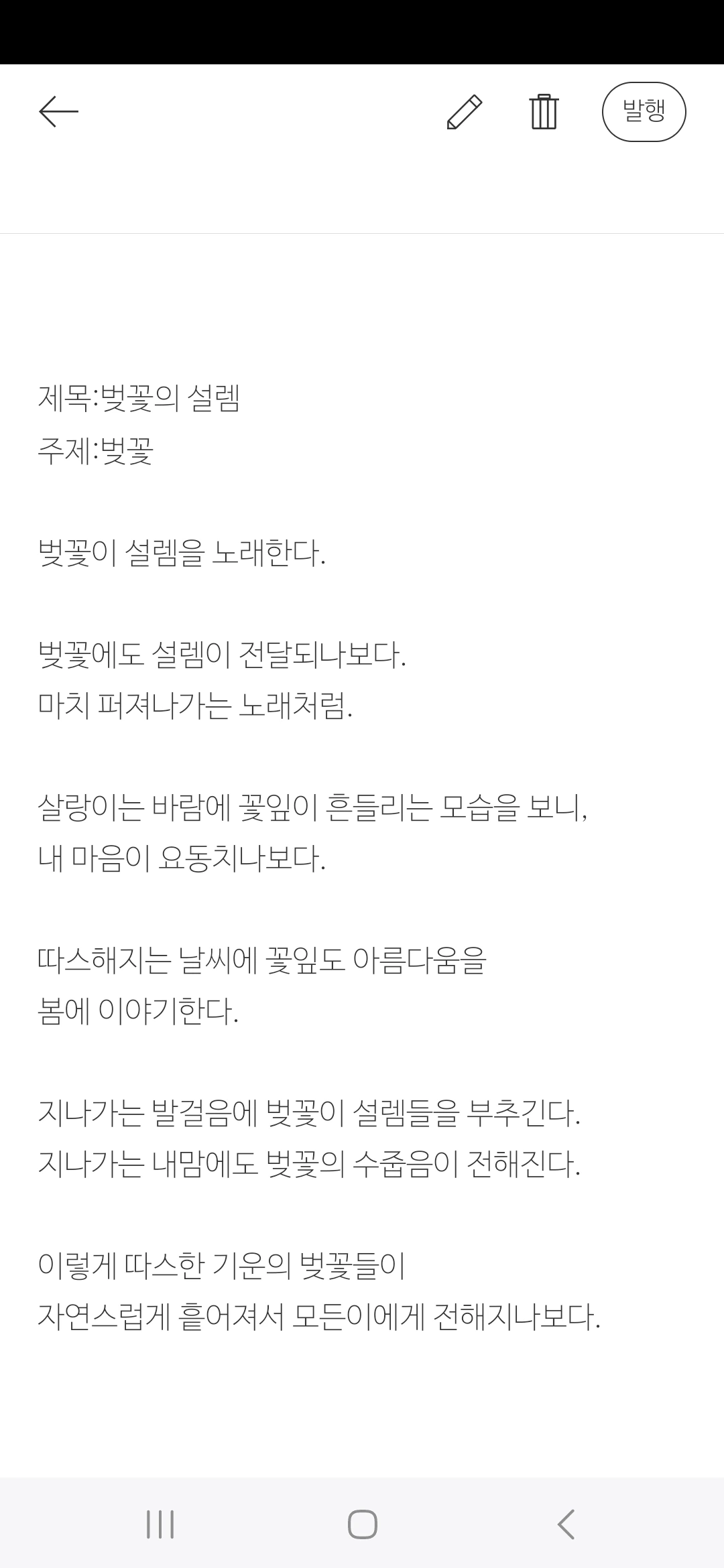 앞으로 우리나라의 4계절 봄, 여름, 가을, 겨울을 지나가며 그 계절의 특성이 담긴 여러 가지 시들도 계속 써보고 싶다. 그때 계절마다 여러 가지 글감가 아이디어가 생각나기를 바란다.