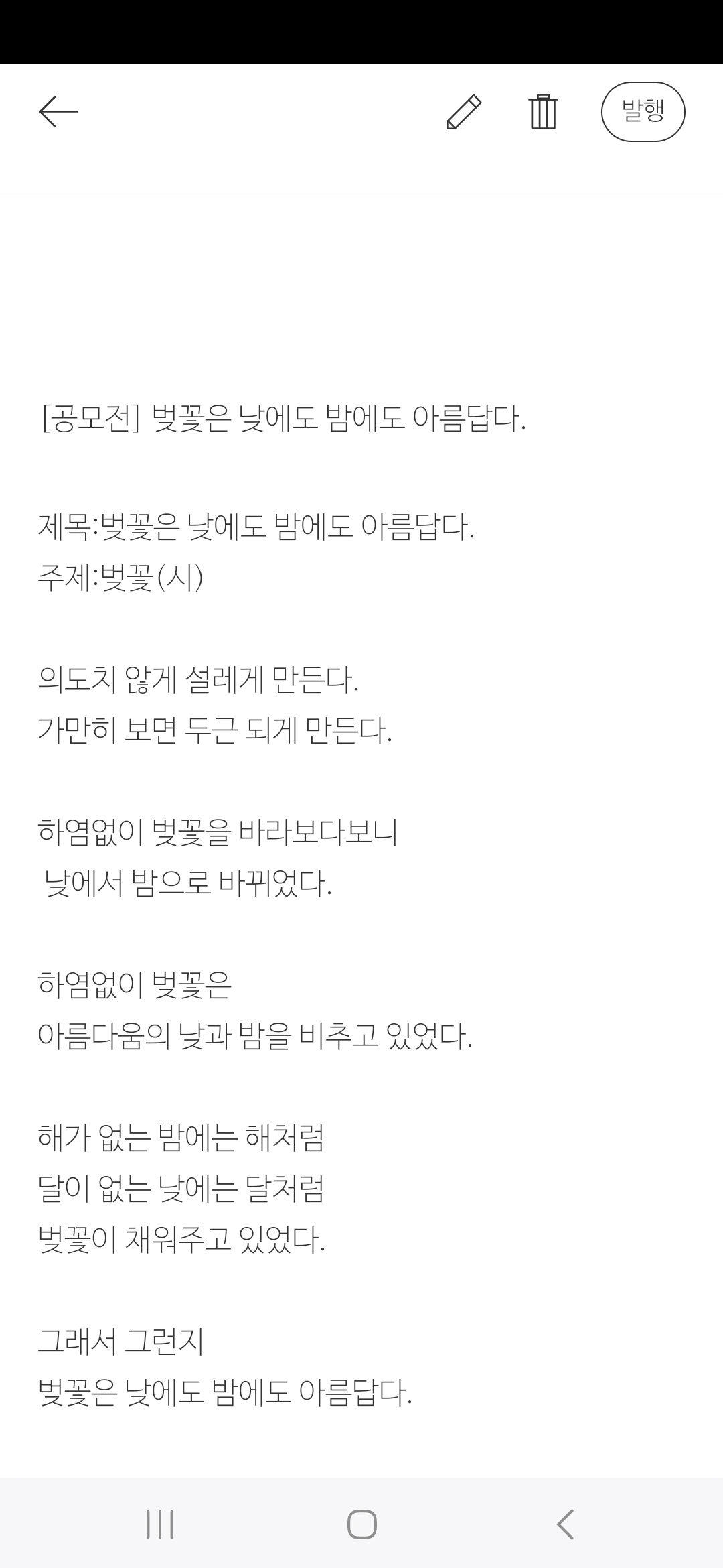 책은 [벚꽃 아래 봄을 쓰다-포레스트 웨일 출판사]이다. 전자책은 며칠 전쯤 출판되었고, 종이책은 일주일정도 걸린다고 했던 것 같다.