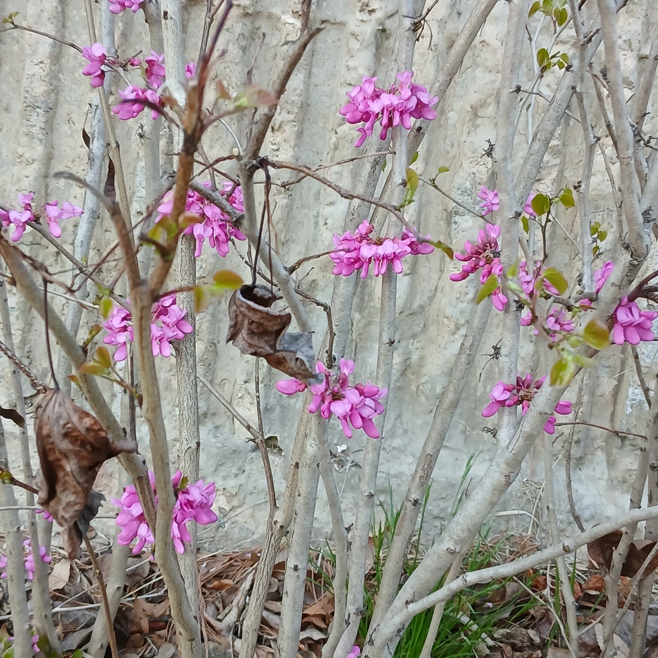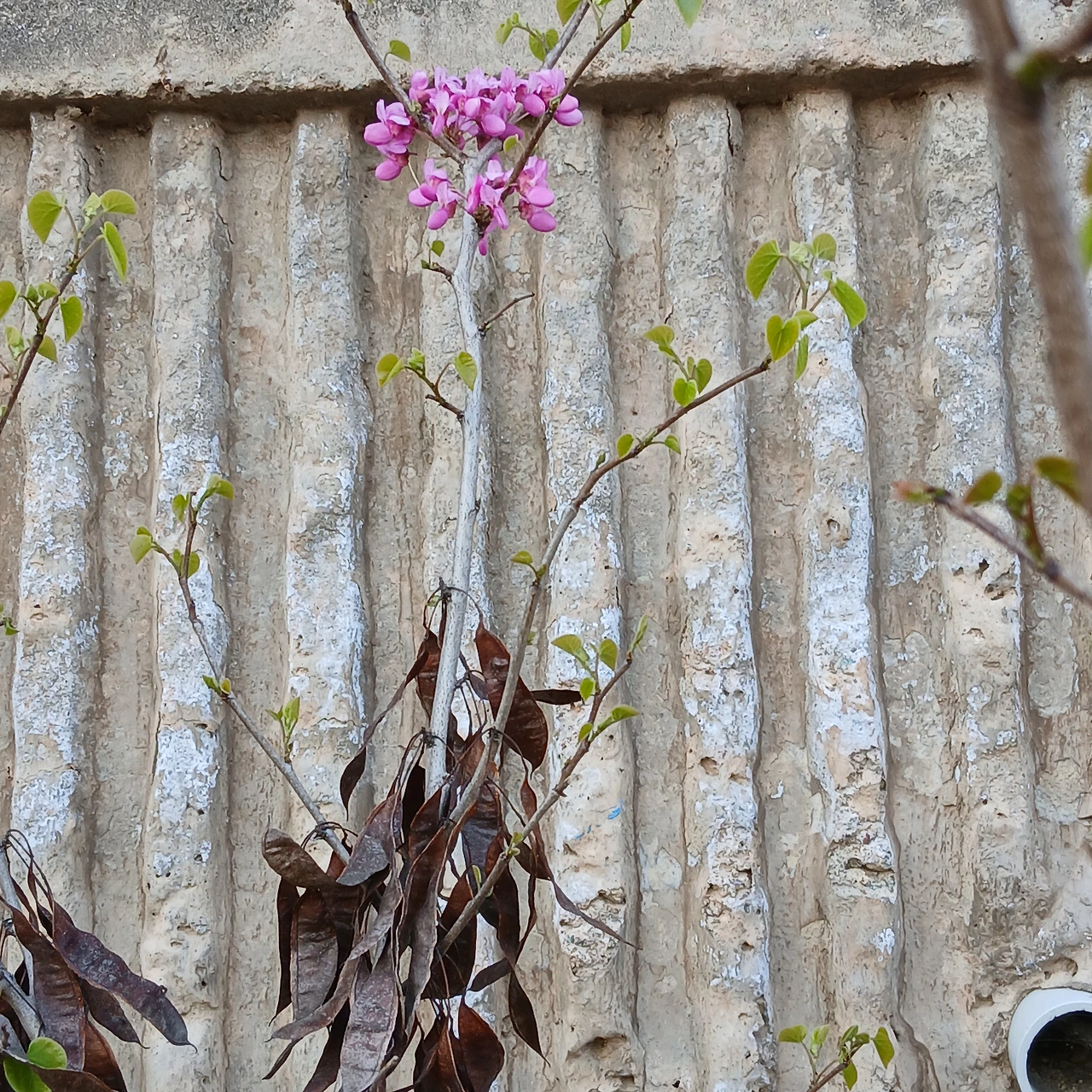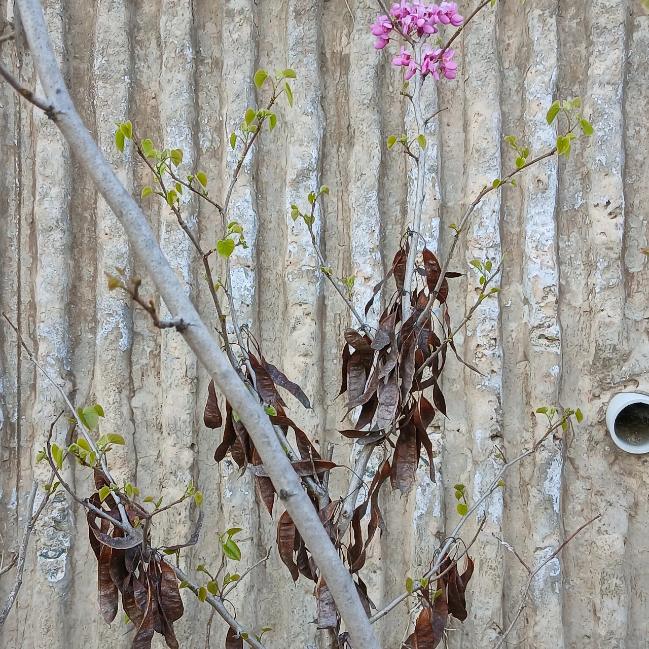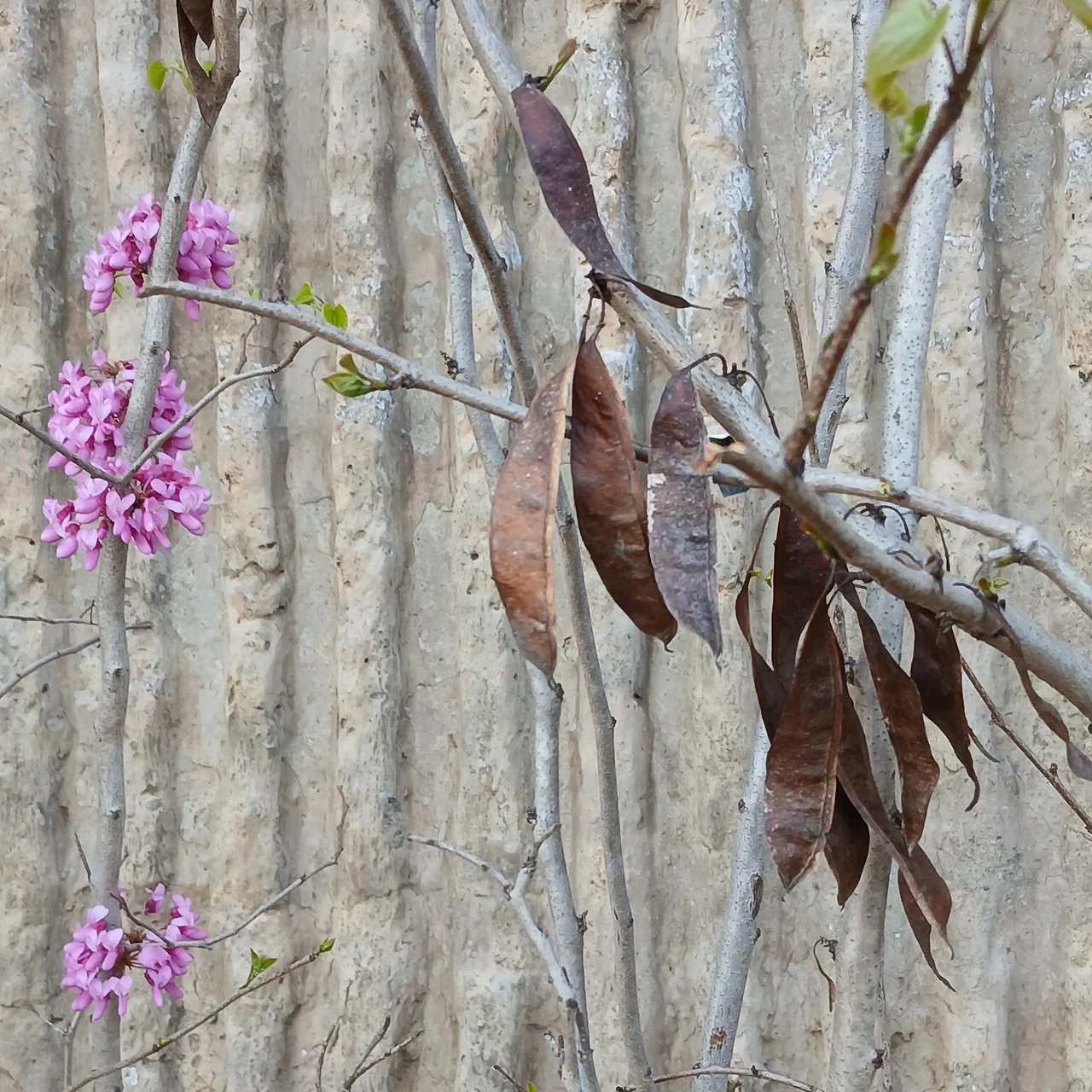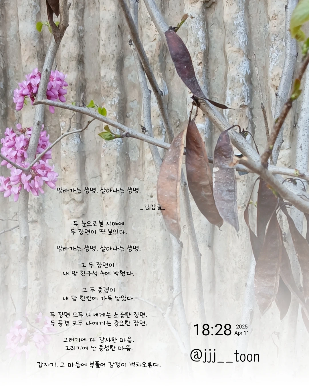 낡고 빛바래진 한 번 잡으면 부스스 부스러질듯한 나뭇잎과 연두색 생명력 가득한 나뭇잎, 진한 분홍색 꽃잎을 하나씩 뽐내면서 생명력을 뿜어내는 이 풍경을 보고 있자니 마치 두 개의 풍경을 같이 보는 느낌이 들면서 시로 표현해보고 싶은 생각을 하게 되었다.