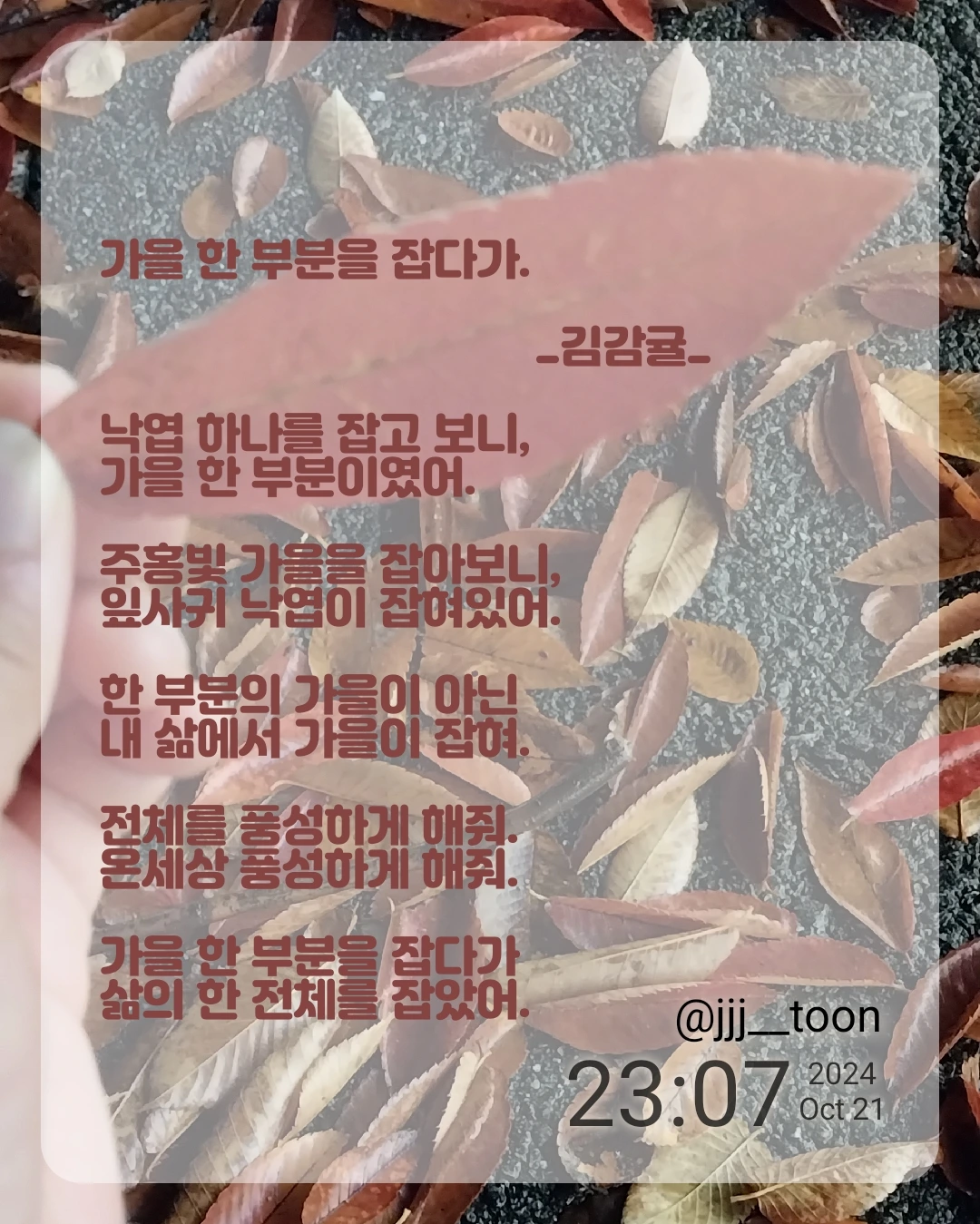 김감귤의 브런치입니다. 시, 짧은 글, 일기를 쓰기도 하며, 자유롭게 글을 쓰고 생각을 표현하는 활동을 좋아합니다. 개인 가치관이나 경험에 비춰 글을 읽을 수 있다고 생각합니다.