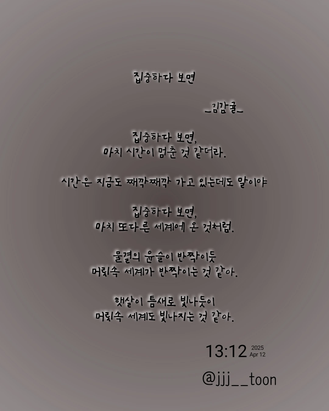 집중하다 보면 _김감귤_집중하다 보면,마치 시간이 멈춘 것 같더라.시간은 지금도 째깍째깍 가고 있는데도 말이야집중하다 보면,마치 또다른 세계에 온 것처럼.물결의 윤슬이 반짝이듯머릿속 세계가 반짝이는 것 같아.햇살이 틈새로 빛나듯이머릿속 세계도 빛나지는 것 같아.