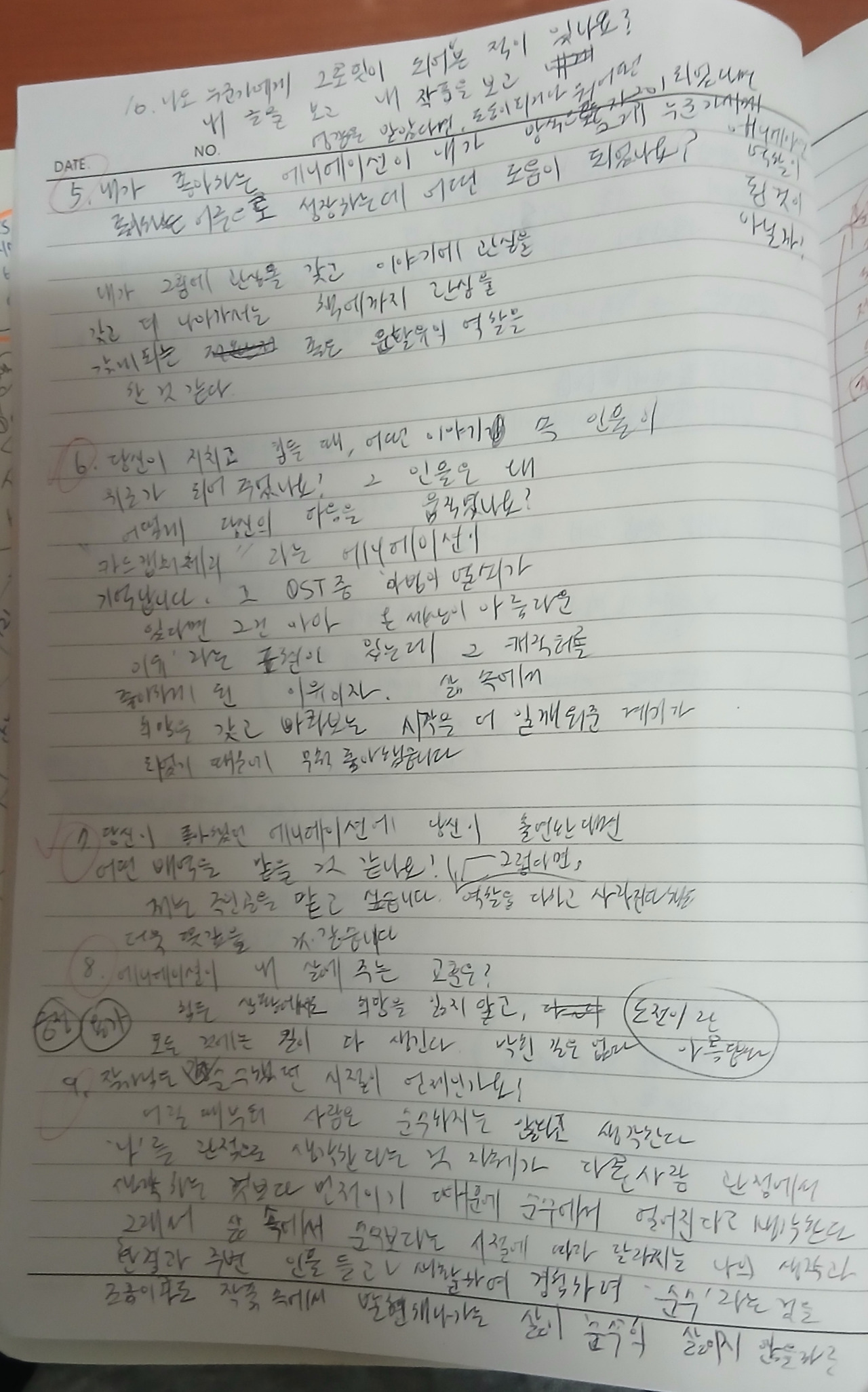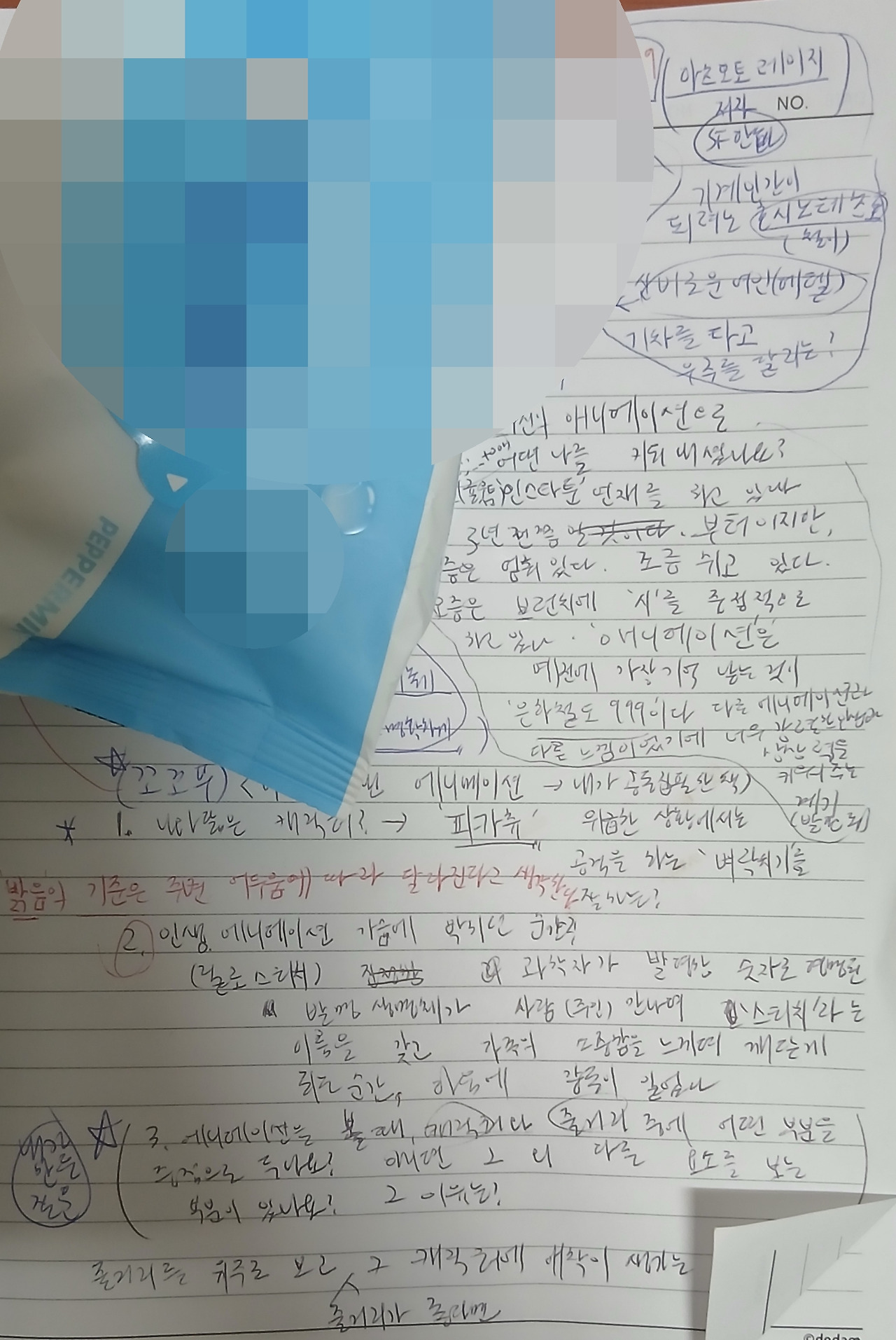 이번 꼬꼬무 독서토론을 위해 못 일어날까 봐 걱정이 되었는지 새벽 4시 30분쯤 눈이 떠졌고, 그때부터 노트에 질문의 답을 생각하며 적어보는 시간을 가졌다. 새벽 시간은 집중하기 좋은 시간이라는 생각이 들었다. 일찍 일어나서 피곤했는데 목캔디 사탕을 하나 입에 물고, 생각에 생각을 하며 적어 내려갔다.