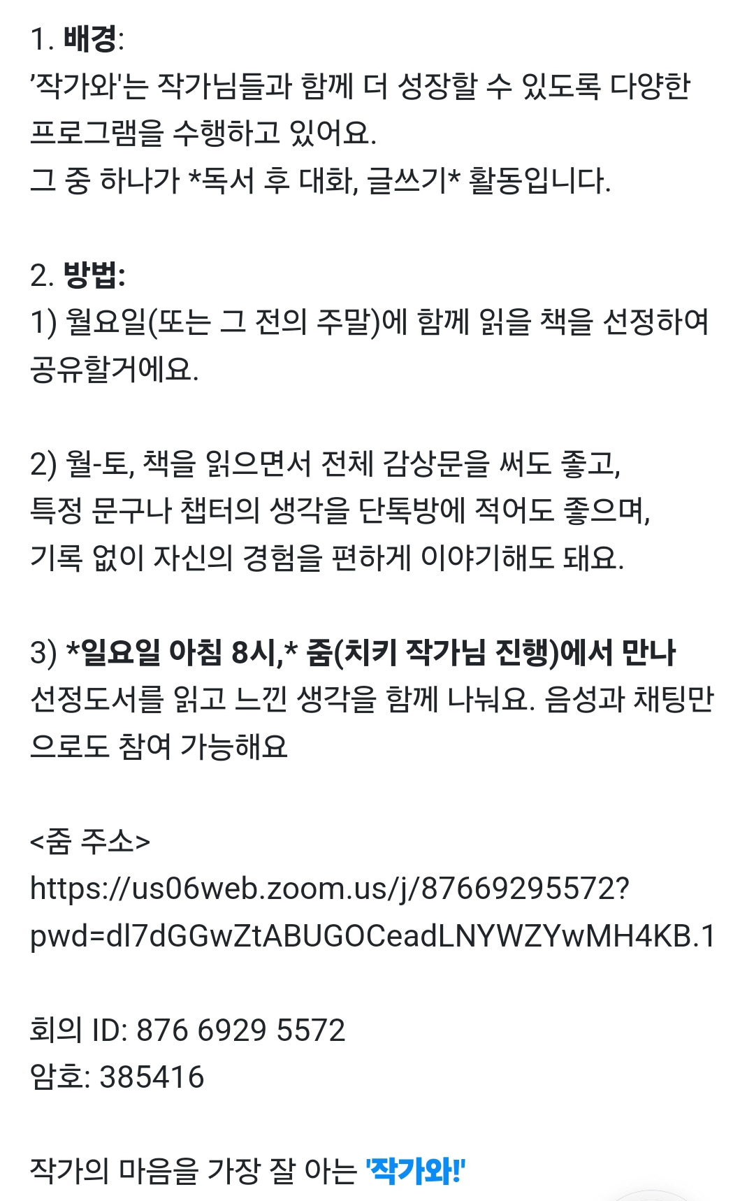 작가와 출판사에서 하는 꼬꼬무 독서토론은 보통 '매주 아침 8시 30분'에 치키 작가님의 주관으로 진행되는 독서토론이다.
