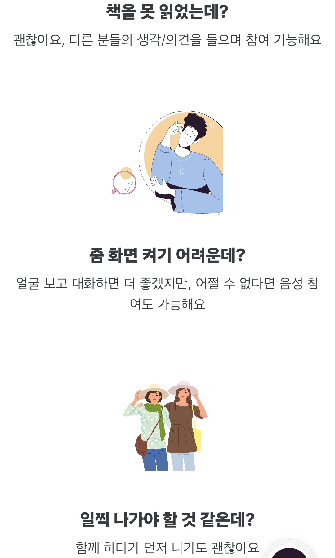 1, 2주에 1번씩 책이 바뀌게 되고 줌으로 약 1시간-1시간 30분 사이 독서토론을 한다.