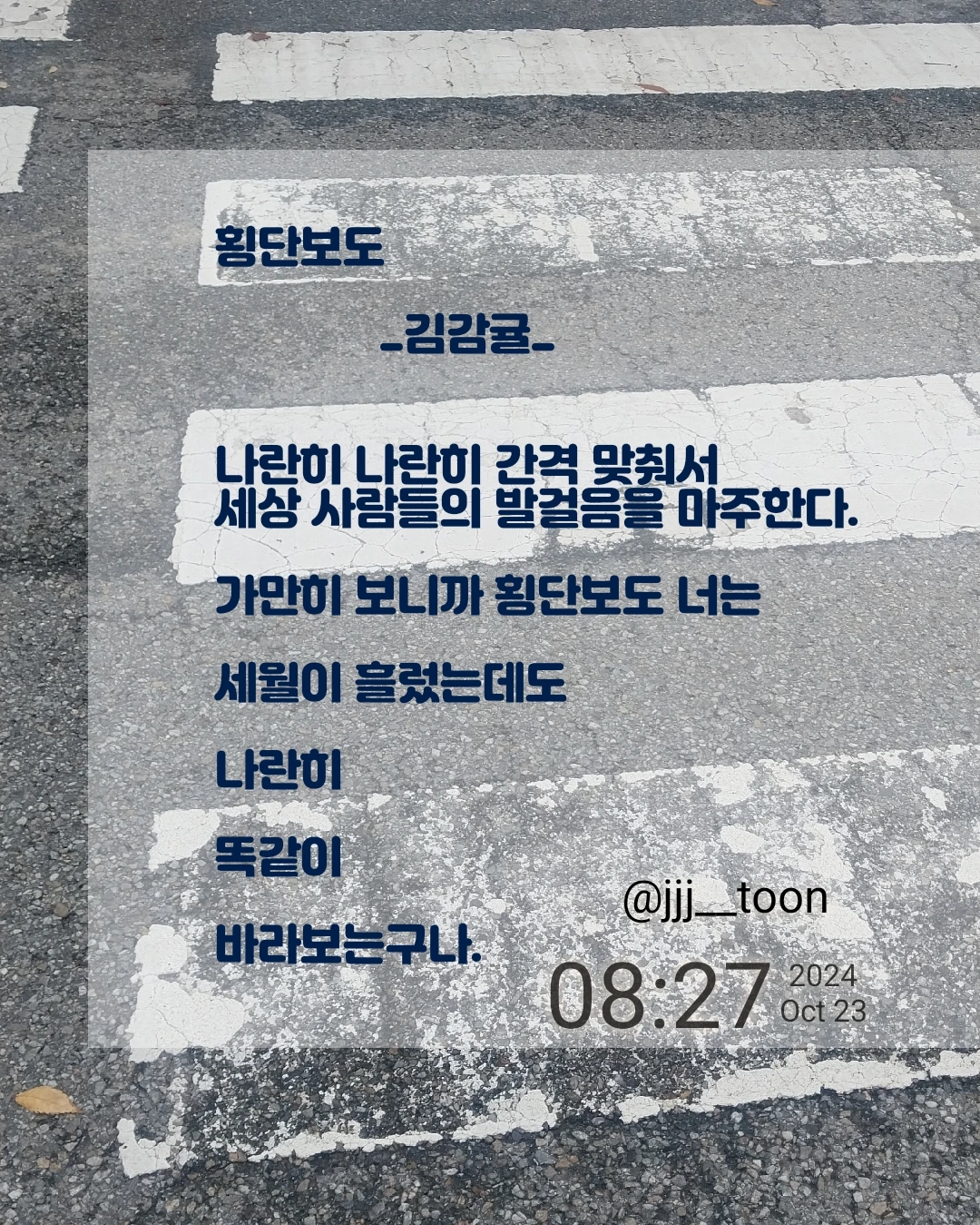 김감귤의 브런치입니다. 시, 짧은 글, 일기를 쓰기도 하며, 자유롭게 글을 쓰고 생각을 표현하는 활동을 좋아합니다. 개인 가치관이나 경험에 비춰 글을 읽을 수 있다고 생각합니다.