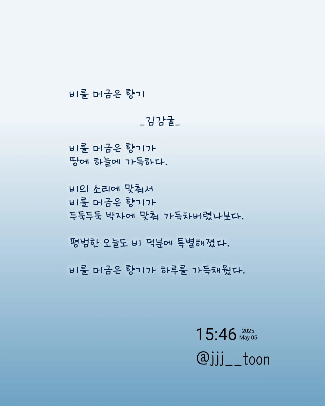 평범한 일상이라도 작은 하나의 생각이나 행동, 마음가짐에 따라 다르게 느낄 수 있는 점을 생각하며 희망적인 시를 담고 싶었습니다.