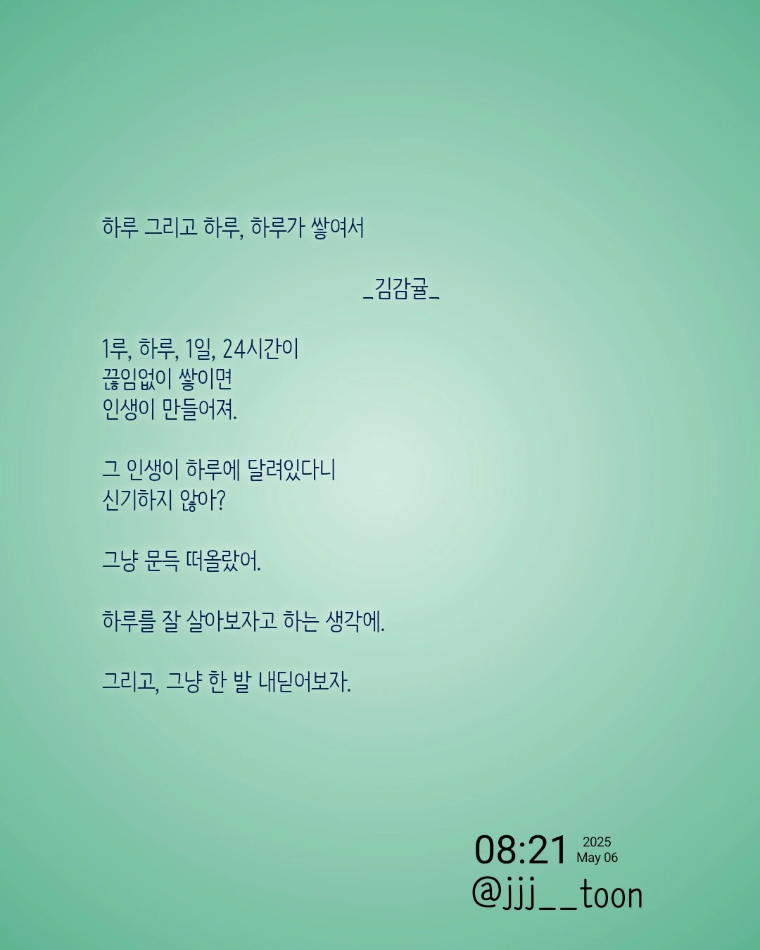 하루 그리고 하루, 하루가 쌓여서 _김감귤_1루, 하루, 1일, 24시간이 끊임없이 쌓이면인생이 만들어져.그 인생이 하루에 달려있다니 신기하지 않아?그냥 문득 떠올랐어.하루를 잘 살아보자고 하는 생각에.그리고, 그냥 한 발 내딛어보자.