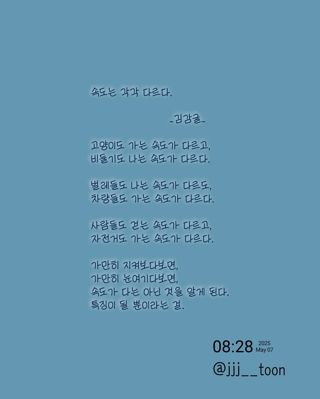 속도는 각각 다르다. _김감귤_고양이도 가는 속도가 다르고,비둘기도 나는 속도가 다르다.벌레들도 나는 속도가 다르도,차량들도 가는 속도가 다르다.사람들도 걷는 속도가 다르고,자전거도 가는 속도가 다르다.가만히 지켜보다보면,가만히 눈여기다보면,속도가 다는 아닌 것을 걸 알게 된다.특징이 될 뿐이라는 걸.