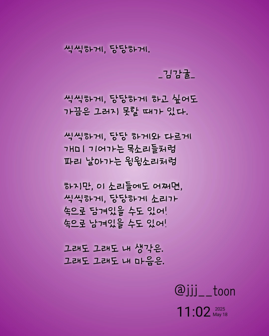 씩씩하게, 당당하게. _김감귤_씩씩하게, 당당하게 하고 싶어도가끔은 그러지 못할 때가 있다.씩씩하게, 당당 하게와 다르게개미 기어가는 목소리들처럼파리 날아가는 윙윙소리처럼하지만, 이 소리들에도 어쩌면, 씩씩하게, 당당하게 소리가 속으로 담겨있을 수도 있어!속으로 남겨있을 수도 있어!그래도 그래도 내 생각은. 그래도 그래도 내 마음은.