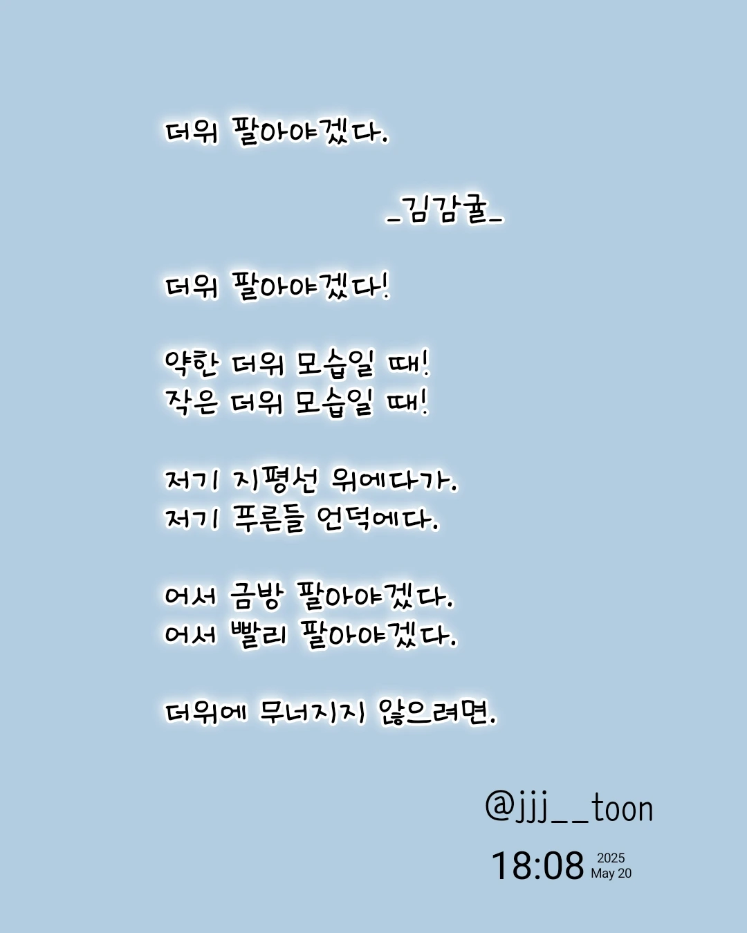 더위 팔아야겠다. _김감귤_더위 팔아야겠다!약한 더위 모습일 때!작은 더위 모습일 때!저기 지평선 위에다가.저기 푸른들 언덕에다.어서 금방 팔아야겠다. 어서 빨리 팔아야겠다.더위에 무너지지 않으려면.