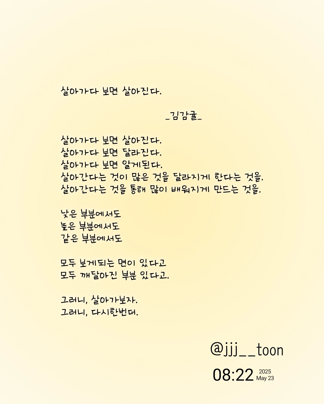 살아가다 보면, 좋은 일도 나쁜 일도 나보다 잘 사는 사람, 못 사는 사람, 비슷하게 사는 사람들 보는 경우도 있잖아요. 그런데 그런 부분에서도 각각의 배울 점 보이는 점이 있었어요. 그래서 그런 부분에서도 살아가는 가치가 있고, 살다보면 뭐든 좋은 점이 있다는 것을 생각하며 살아가자는 의미로 시를 써봤습니다.