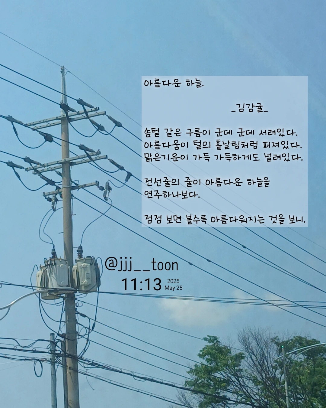 아름다운 하늘. _김감귤_솜털 같은 구름이 군데 군데 서려있다.아름다움이 털의 흩날림처럼 퍼져있다.맑은기운이 가득 가득하게도 널려있다.전선줄의 줄이 아름다운 하늘을 연주하나보다.점점 보면 볼수록 아름다워지는 것을 보니.