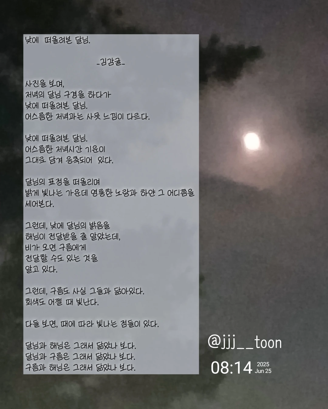 빛나는 부분은 일상에서 생활 속에서 다 다르다. 달님과 해님, 구름 다 생김새가 다르다. 그렇지만, 각자 하는 역할이 있고 장점이 있다. 그런 점에서 다 다르게 빛나는 것이라고 생각한다. 이것을 인생에서 생각해 본다면 사람들마다 다 각자의 좋은 점에서 빛난다는 생각으로 이렇게 시를 적어보게 되었다.