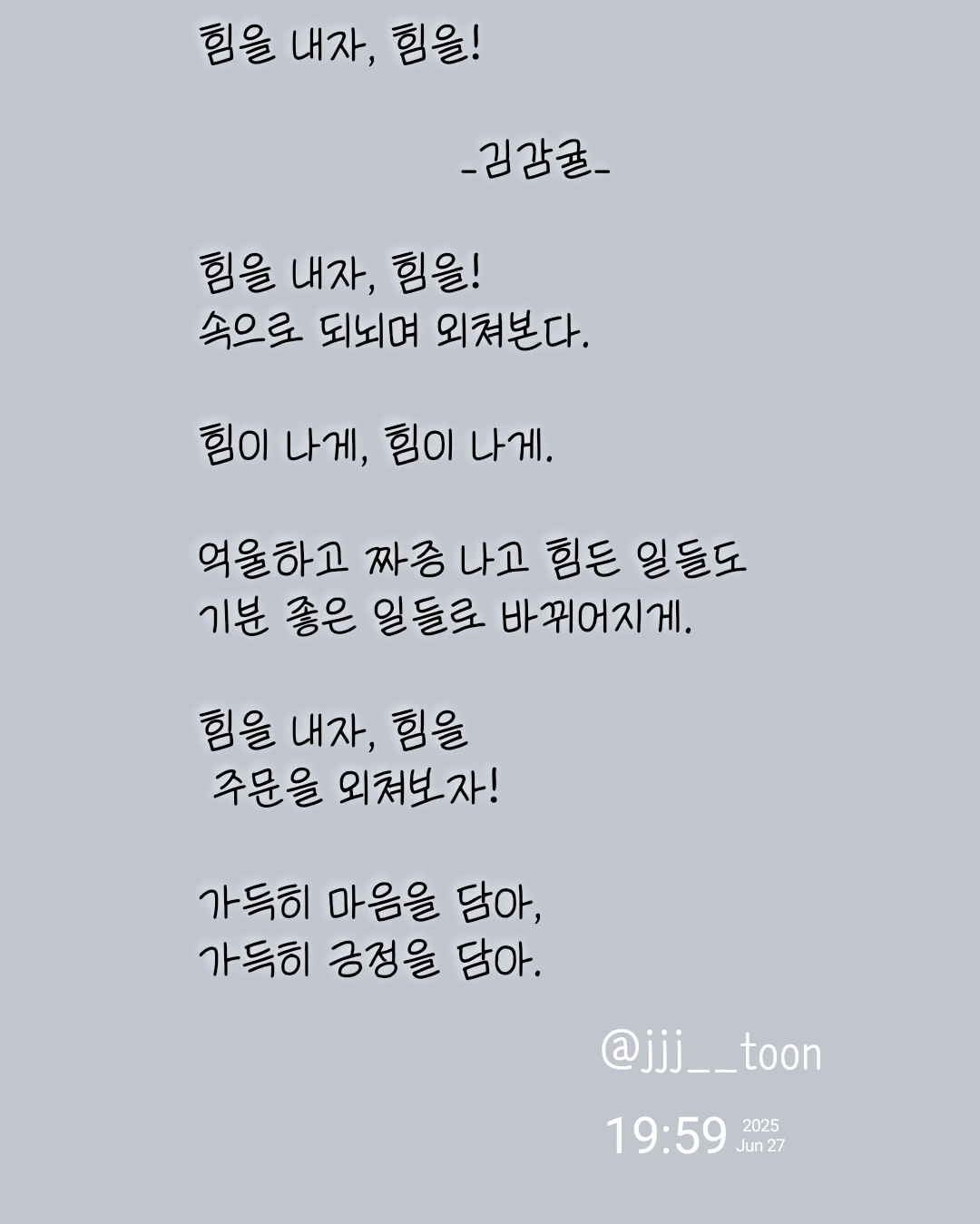 힘을 내자, 힘을! _김감귤_힘을 내자, 힘을!속으로 되뇌며 외쳐본다.힘이 나게, 힘이 나게.억울하고 짜증 나고 힘든 일들도기분 좋은 일들로 바뀌어지게.