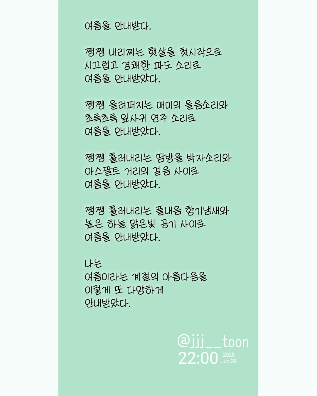여름을 안내받다.쨍쨍 내리찌는 햇살을 첫시작으로시끄럽고 경쾌한 파도 소리로여름을 안내받았다.쨍쨍 울려퍼지는 매미의 울음소리와초록초록 잎사귀 연주 소리로여름을 안내받았다.쨍쨍 흘러내리는 땀방울 박자소리와아스팔트 거리의 걸음 사이로여름을 안내받았다.쨍쨍 흘러내리는 풀내음 향기냄새와높은 하늘 맑은빛 공기 사이로여름을 안내받았다.나는 여름이라는 계절의 아름다움을이렇게 또 다양하게안내받았다.