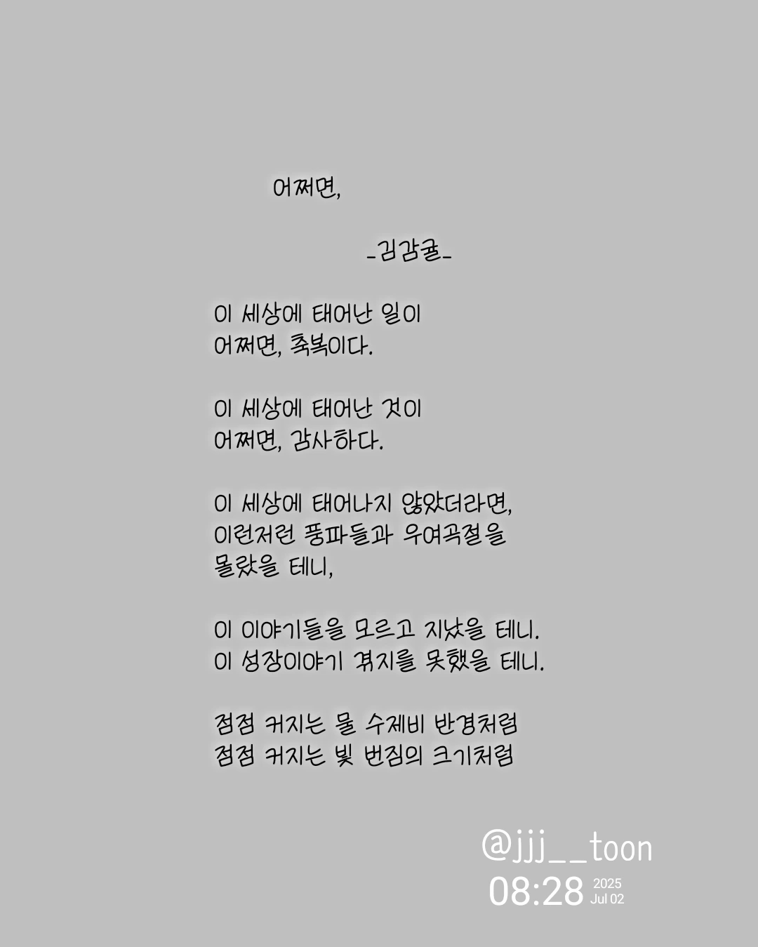 어쩌면, _김감귤_이 세상에 태어난 일이어쩌면, 축복이다.이 세상에 태어난 것이어쩌면, 감사하다.이 세상에 태어나지 않았더라면,이런저런 풍파들과 우여곡절을몰랐을 테니,이 이야기들을 모르고 지났을 테니.이 성장이야기 겪지를 못했을 테니.점점 커지는 물 수제비 반경처럼점점 커지는 빛 번짐의 크기처럼