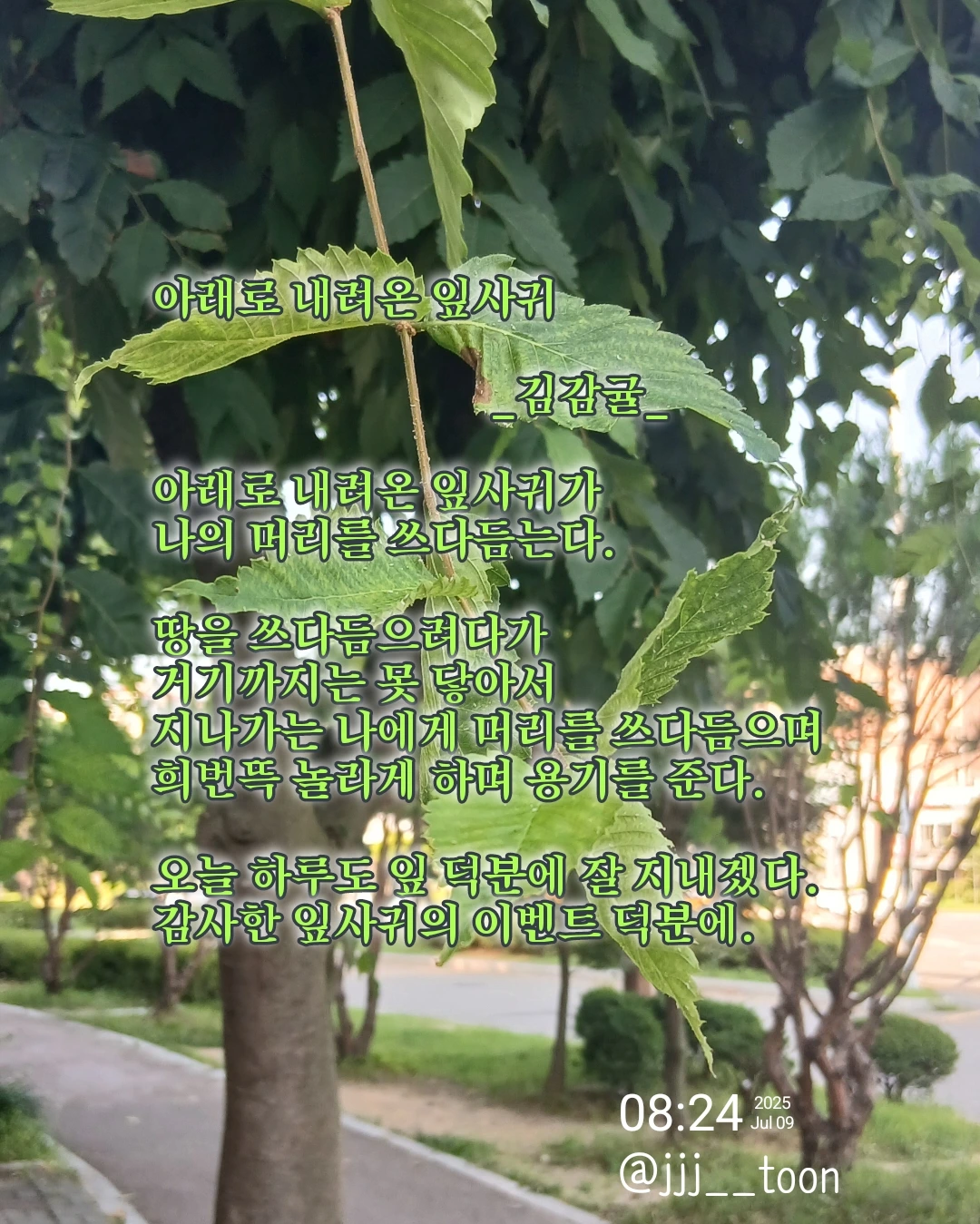 아래로 내려온 잎사귀 _김감귤_아래로 내려온 잎사귀가 나의 머리를 쓰다듬는다.땅을 쓰다듬으려다가거기까지는 못 닿아서지나가는 나에게 머리를 쓰다듬으며희번뜩 놀라게 하며 용기를 준다.오늘 하루도 잎 덕분에 잘 지내겠다.감사한 잎사귀의 이벤트 덕분에.