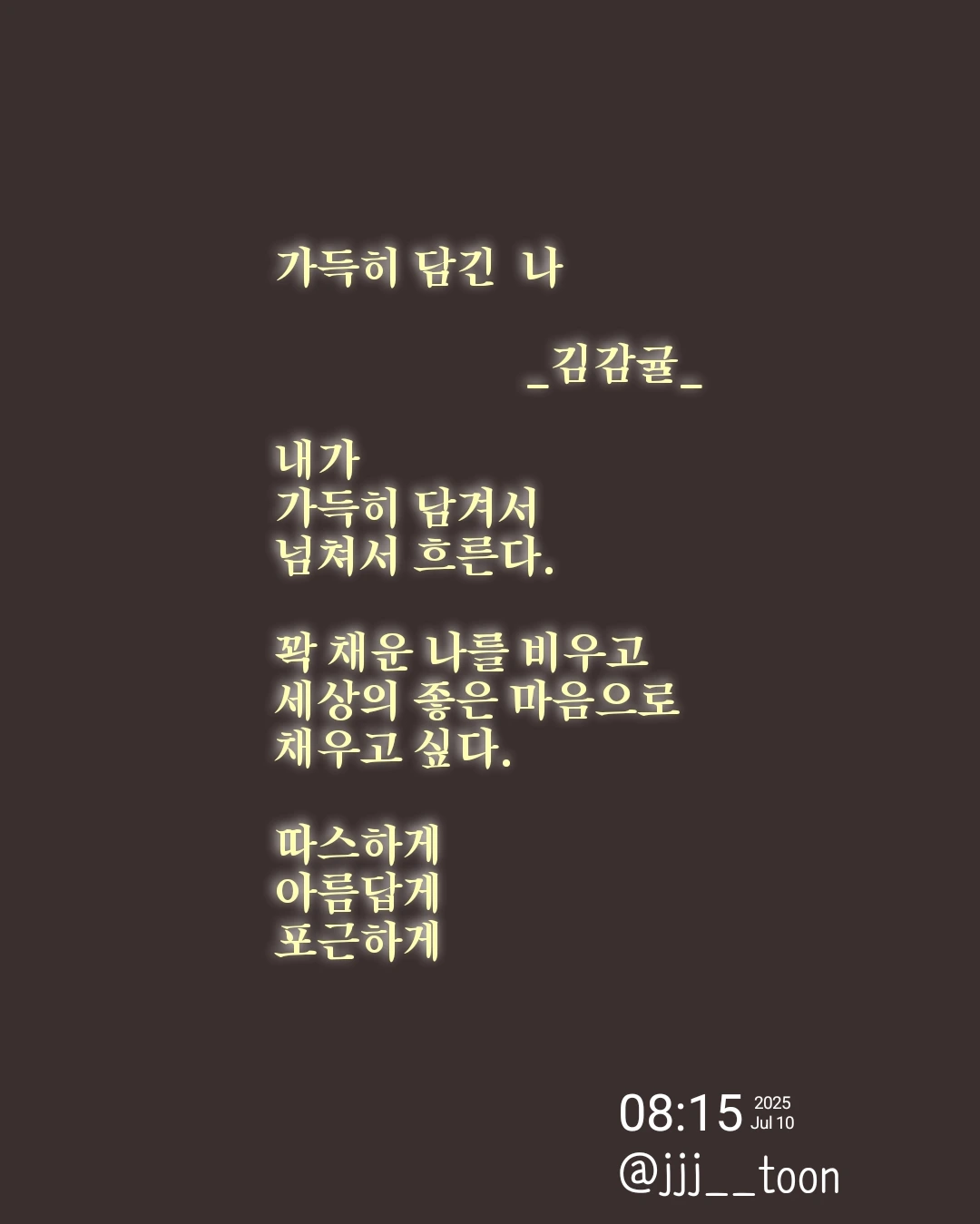 가득히 담긴 나 _김감귤_내가가득히 담겨서넘쳐서 흐른다.꽉 채운 나를 비우고세상의 좋은 마음으로 채우고 싶다.따스하게아름답게포근하게