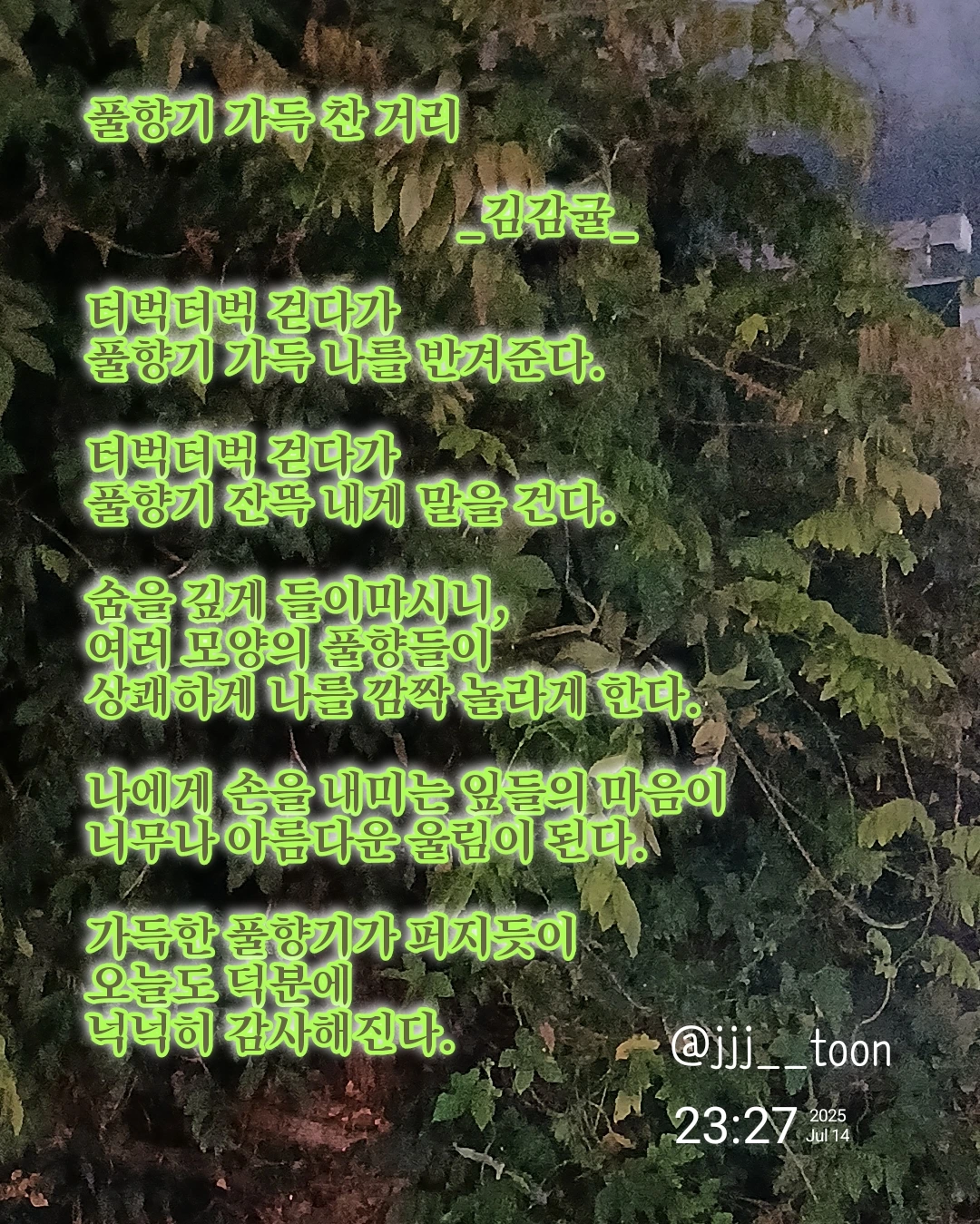 풀향기 가득 찬 거리 _김감귤_터벅터벅 걷다가풀향기 가득 나를 반겨준다.터벅터벅 걷다가풀향기 잔뜩 내게 말을 건다.숨을 깊게 들이마시니,여러 모양의 풀향들이상쾌하게 나를 깜짝 놀라게 한다.나에게 손을 내미는 잎들의 마음이너무나 아름다운 울림이 된다.가득한 풀향기가 퍼지듯이 오늘도 덕분에넉넉히 감사해진다.