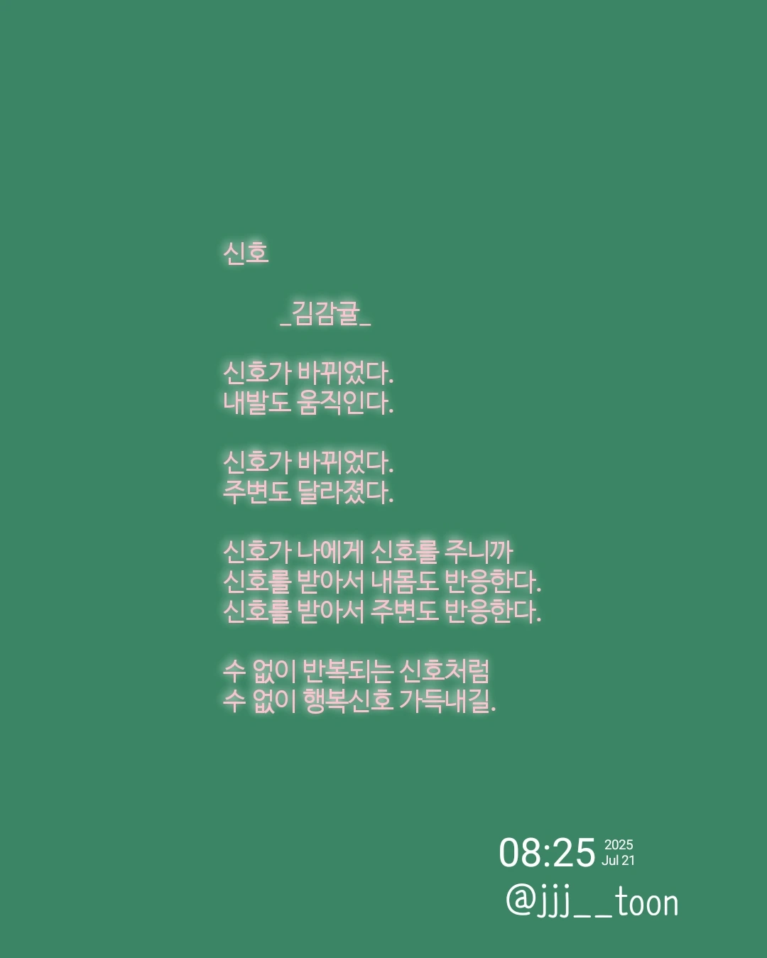 신호 _김감귤_신호가 바뀌었다.내발도 움직인다.신호가 바뀌었다.주변도 달라졌다.신호가 나에게 신호를 주니까신호를 받아서 내몸도 반응한다.신호를 받아서 주변도 반응한다.수 없이 반복되는 신호처럼수 없이 행복신호 가득내길.