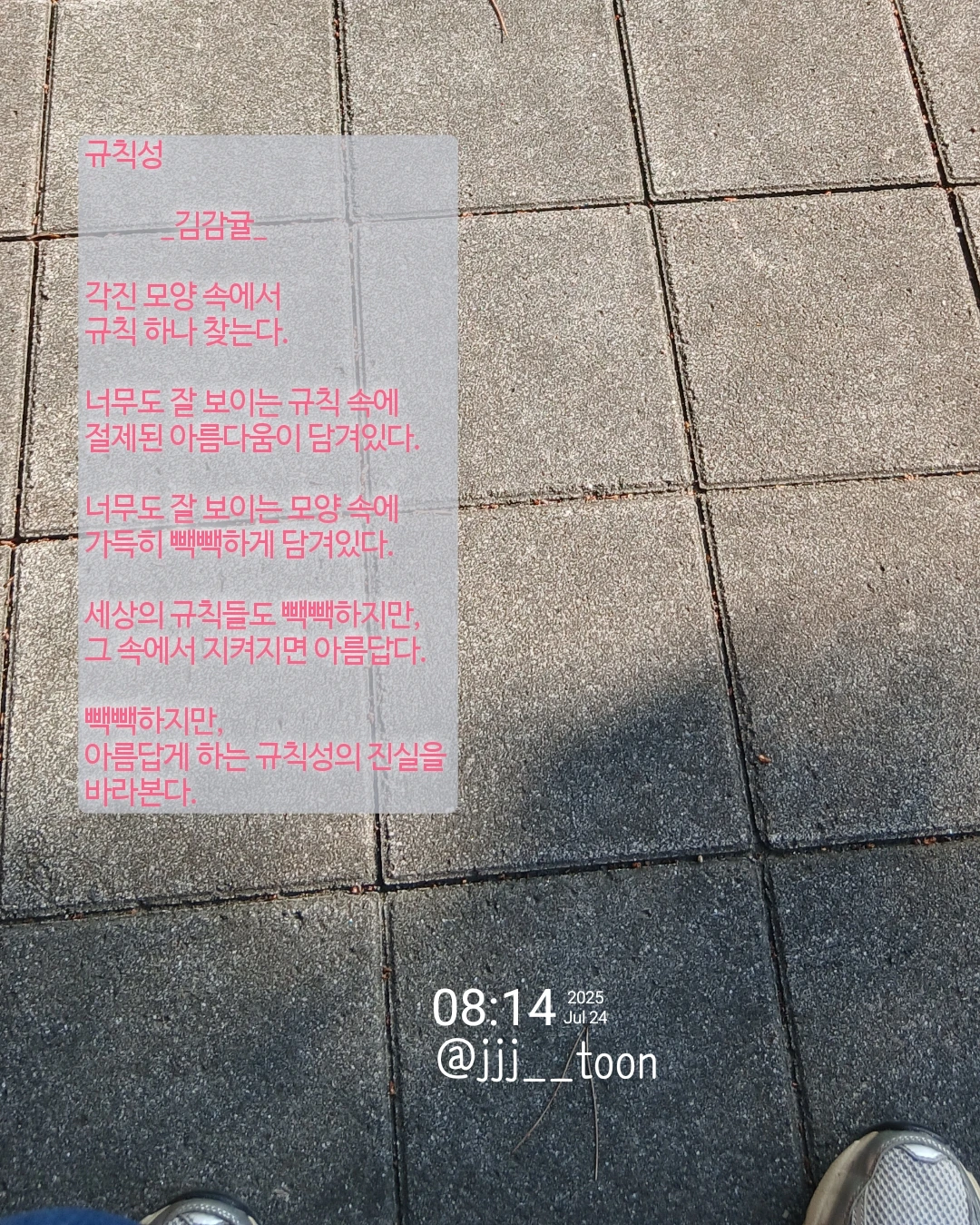 규칙성 _김감귤_각진 모양 속에서규칙 하나 찾는다.너무도 잘 보이는 규칙 속에 절제된 아름다움이 담겨있다.너무도 잘 보이는 모양 속에가득히 빽빽하게 담겨있다.세상의 규칙들도 빽빽하지만,그 속에서 지켜지면 아름답다.빽빽하지만, 아름답게 하는 규칙성의 진실을 바라본다.