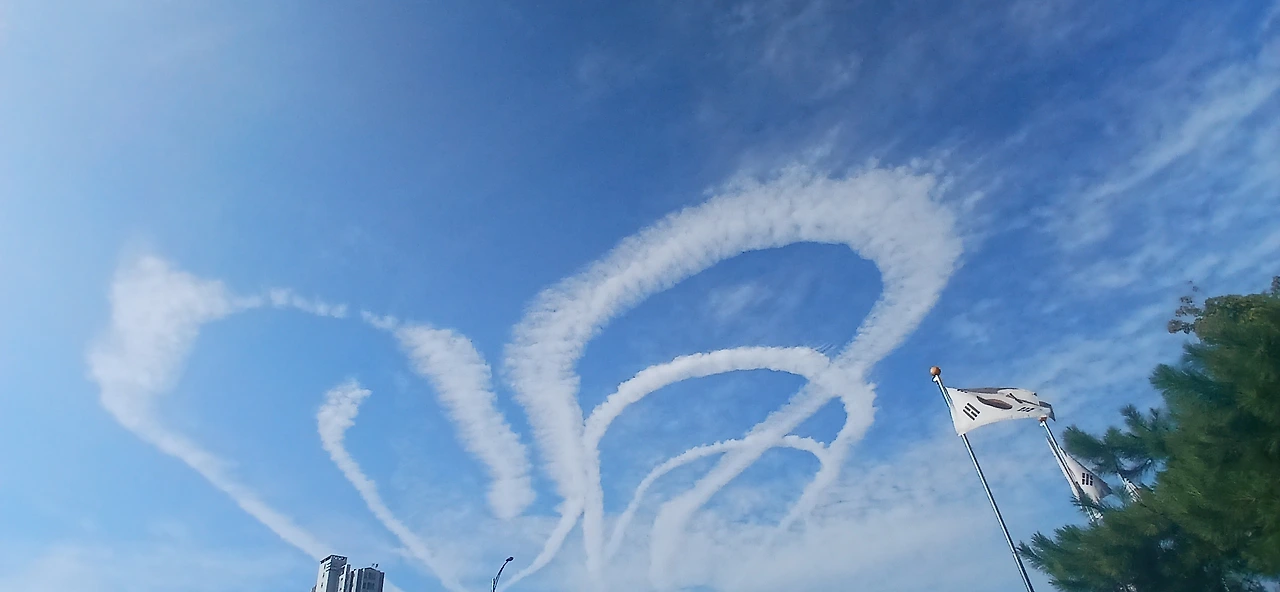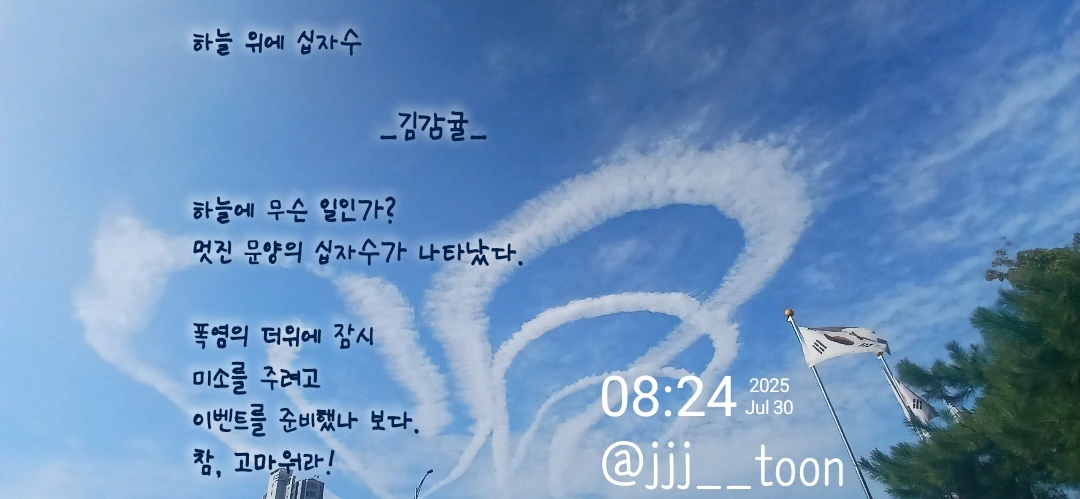 하늘 위에 십자수 _김감귤_하늘에 무슨 일인가?멋진 문양의 십자수가 나타났다.폭염의 더위에 잠시 미소를 주려고이벤트를 준비했나 보다.참, 고마워라!