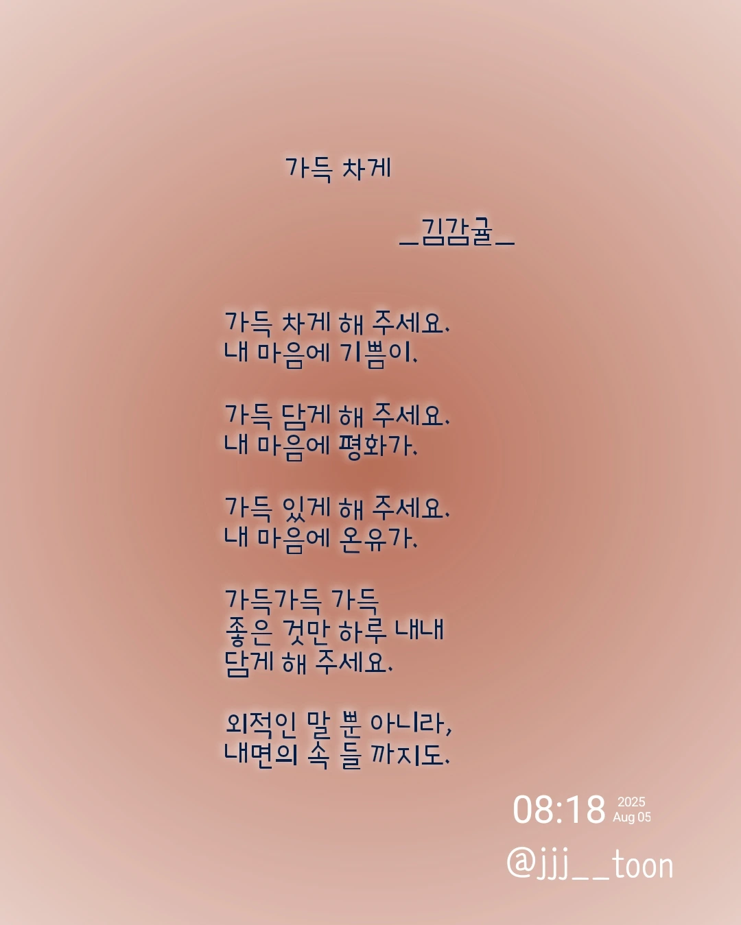 가득 차게 _김감귤_가득 차게 해 주세요.내 마음에 기쁨이.가득 담게 해 주세요.내 마음에 평화가.가득 있게 해 주세요.내 마음에 온유가.가득가득 가득좋은 것만 하루 내내담게 해 주세요.외적인 말 뿐 아니라,내면의 속 들 까지도.