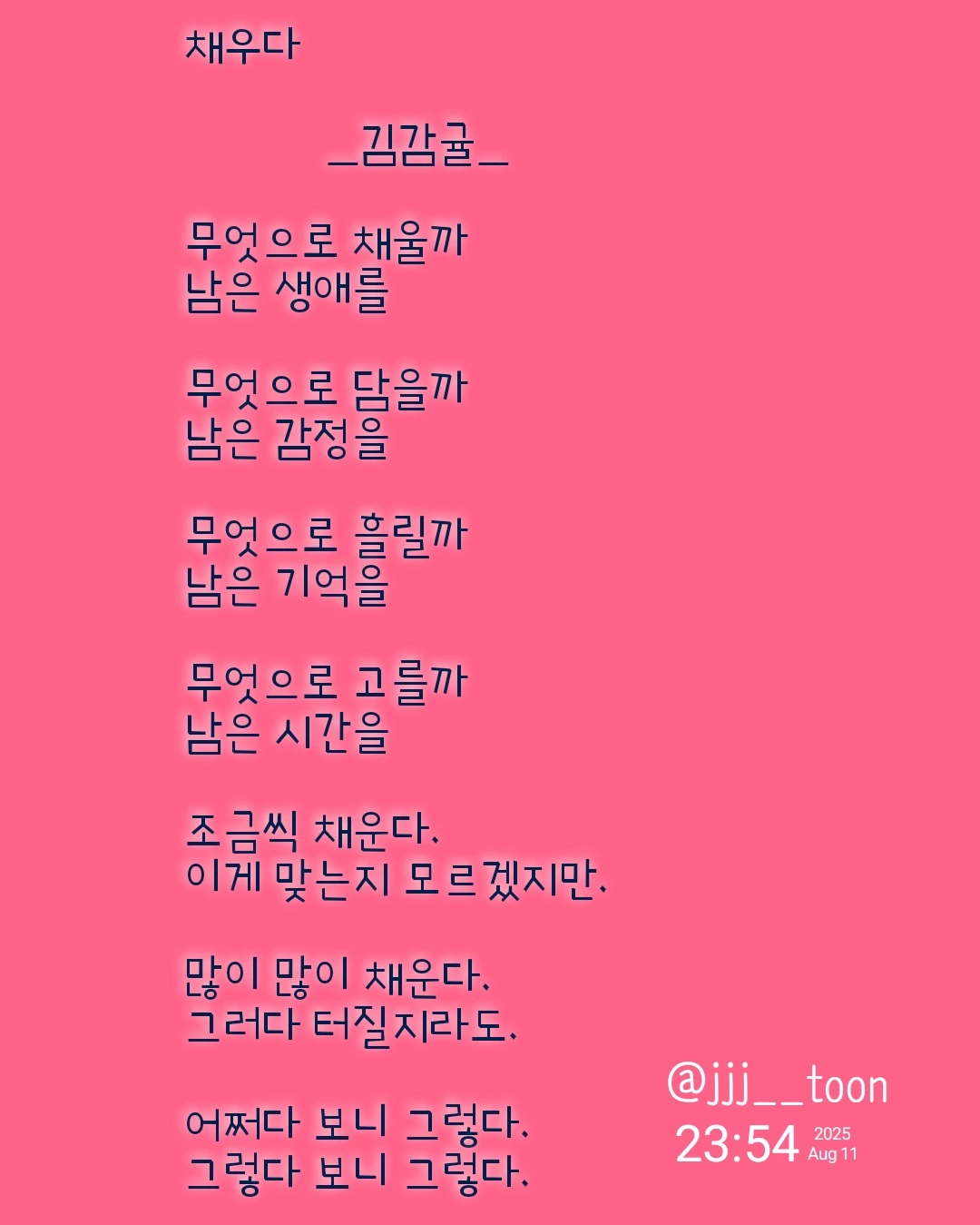 채우다 _김감귤_무엇으로 채울까남은 생애를무엇으로 담을까남은 감정을무엇으로 흘릴까남은 기억을무엇으로 고를까남은 시간을조금씩 채운다.이게 맞는지 모르겠지만.많이 많이 채운다.그러다 터질지라도.어쩌다 보니 그렇다.그렇다 보니 그렇다.이게 인생인 걸까.