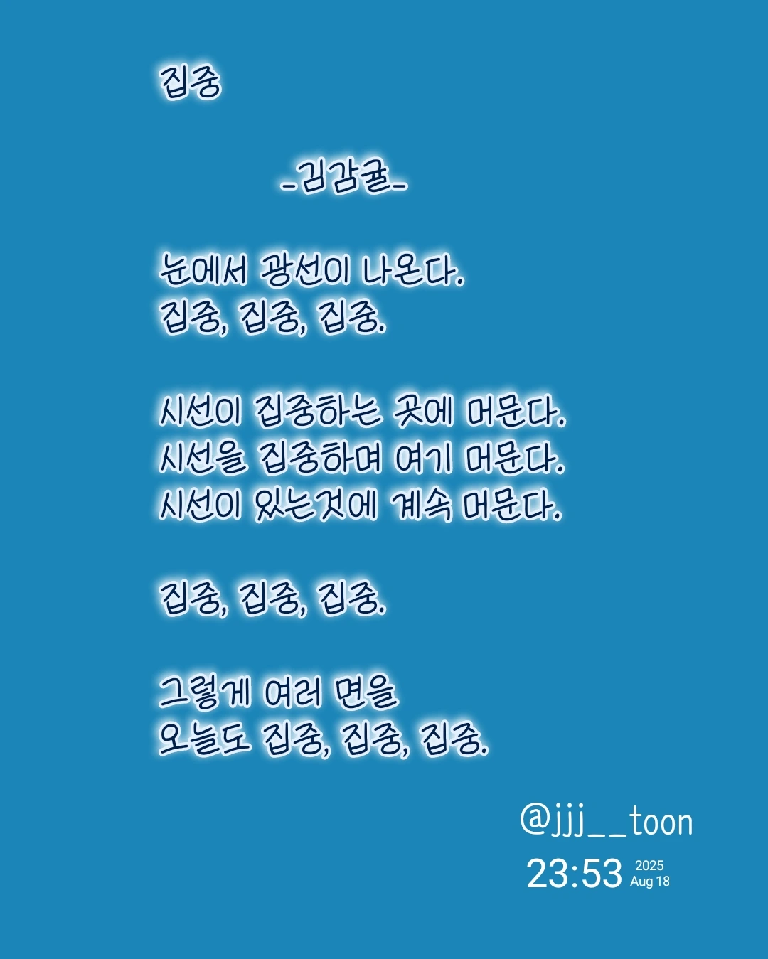 집중 _김감귤_눈에서 광선이 나온다.집중, 집중, 집중.시선이 집중하는 곳에 머문다.시선을 집중하며 여기 머문다.시선이 있는것에 계속 머문다.집중, 집중, 집중.그렇게 여러 면을오늘도 집중, 집중, 집중.