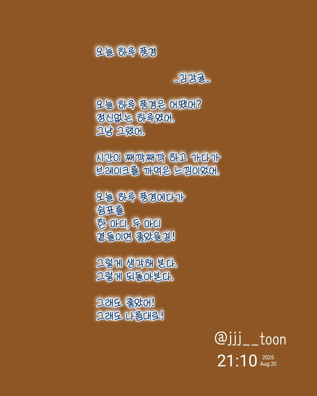 오늘 하루 풍경 _김감귤_오늘 하루 풍경은 어땠어?정신없는 하루였어.그냥 그랬어.시간이 째깍째깍 하고 가다가브레이크를 까먹은 느낌이었어.오늘 하루 풍경에다가쉼표를 한 마디, 두 마디 곁들이면 좋았을걸!그렇게 생각해 본다.그렇게 되돌아본다.그래도 좋았어!그래도 나름대로!