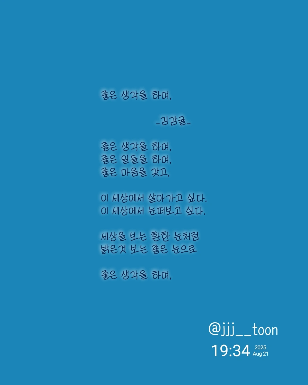 좋은 생각을 하며, _김감귤_좋은 생각을 하며,좋은 일들을 하며,좋은 마음을 갖고,이 세상에서 살아가고 싶다.이 세상에서 눈떠보고 싶다.세상을 보는 환한 눈처럼밝은것 보는 좋은 눈으로좋은 생각을 하며,