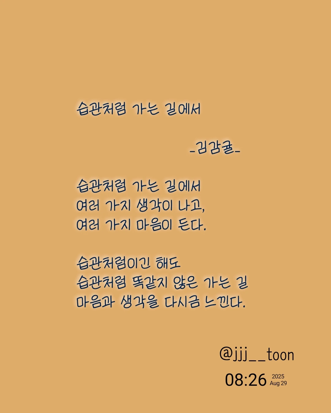 습관처럼 가는 길에서 _김감귤_습관처럼 가는 길에서여러 가지 생각이 나고,여러 가지 마음이 든다.습관처럼이긴 해도습관처럼 똑같지 않은 가는 길 마음과 생각을 다시금 느낀다.
