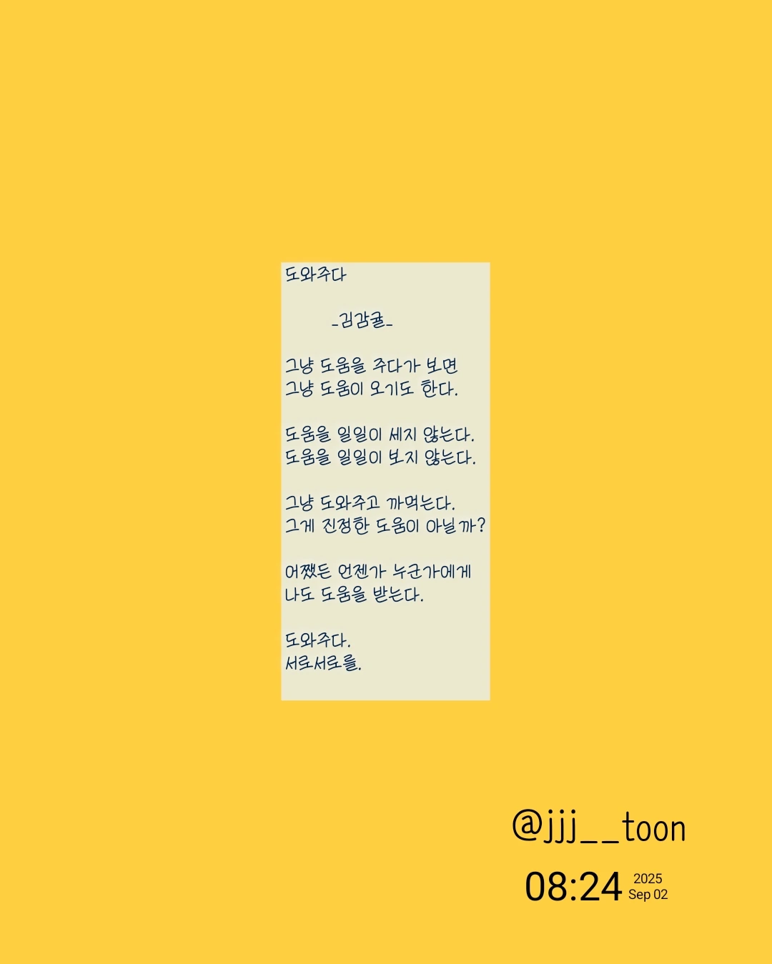 도와주다 _김감귤_그냥 도움을 주다가 보면그냥 도움이 오기도 한다.도움을 일일이 세지 않는다.도움을 일일이 보지 않는다.그냥 도와주고 까먹는다.그게 진정한 도움이 아닐까?어쨌든 언젠가 누군가에게 나도 도움을 받는다.도와주다.서로서로를.