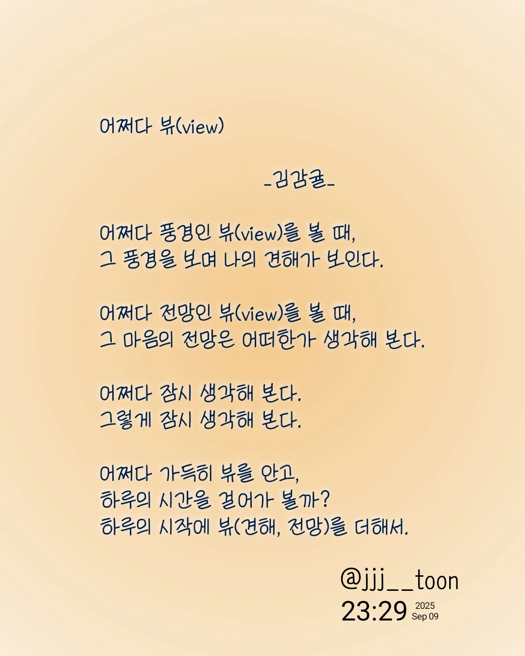 어쩌다 뷰(view) _김감귤_어쩌다 풍경인 뷰(view)를 볼 때,그 풍경을 보며 나의 견해가 보인다.어쩌다 전망인 뷰(view)를 볼 때,그 마음의 전망은 어떠한가 생각해 본다.어쩌다 잠시 생각해 본다.그렇게 잠시 생각해 본다.어쩌다 가득히 뷰를 안고, 하루의 시간을 걸어가 볼까?하루의 시작에 뷰(견해, 전망)를 더해서.