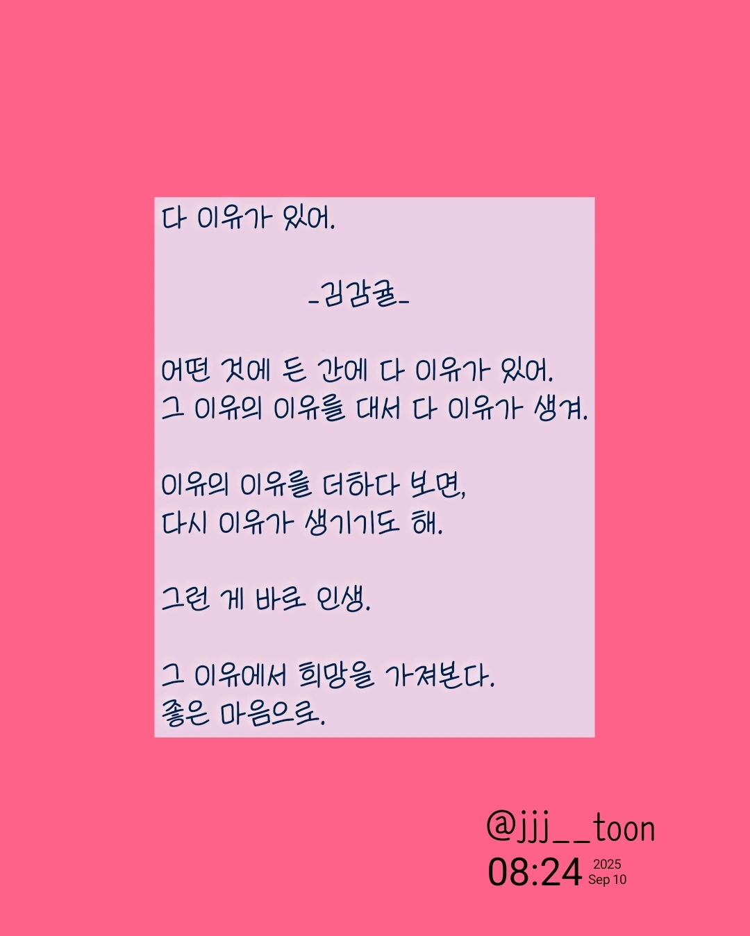 다 이유가 있어. _김감귤_어떤 것에 든 간에 다 이유가 있어.그 이유의 이유를 대서 다 이유가 생겨.이유의 이유를 더하다 보면,다시 이유가 생기기도 해.그런 게 바로 인생.그 이유에서 희망을 가져본다.좋은 마음으로.