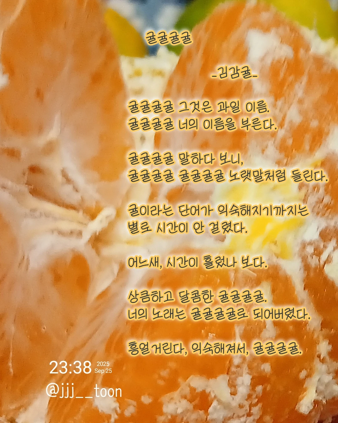 귤귤귤귤 _김감귤_귤귤귤귤 그것은 과일 이름.귤귤귤귤 너의 이름을 부른다.귤귤귤귤 말하다 보니,귤귤귤귤 귤귤귤귤 노랫말처럼 들린다.귤이라는 단어가 익숙해지기까지는 별로 시간이 안 걸렸다.어느새, 시간이 흘렀나 보다.상큼하고 달콤한 귤귤귤귤.너의 노래는 귤귤귤귤로 되어버렸다.흥얼거린다, 익숙해져서, 귤귤굴귤.