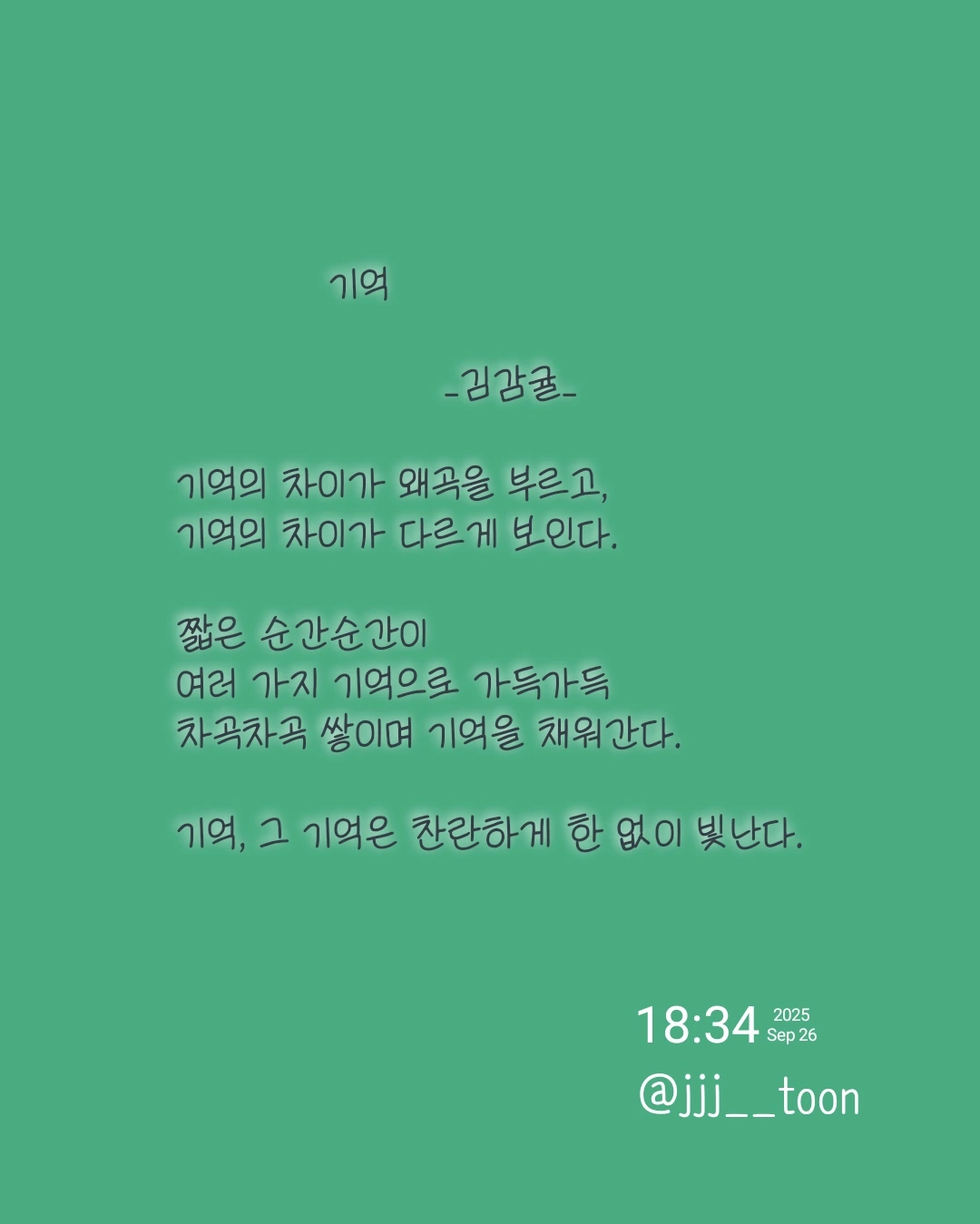 기억 _김감귤_기억의 차이가 왜곡을 부르고,기억의 차이가 다르게 보인다.짧은 순간순간이 여러 가지 기억으로 가득가득차곡차곡 쌓이며 기억을 채워간다.기억, 그 기억은 찬란하게 한 없이 빛난다.
