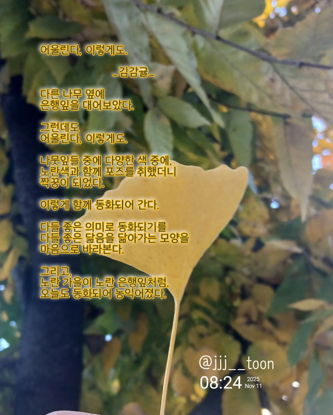 어울린다, 이렇게도. _김감귤_다른 나무 옆에 은행잎을 대어보았다.그런데도어울린다, 이렇게도.나뭇잎들 중에 다양한 색 중에,노란색과 함께 포즈를 취했더니짝꿍이 되었다.이렇게 함께 동화되어 간다.다들 좋은 의미로 동화되기를다들 좋은 닮음을 닮아가는 모양을마음으로 바라본다.그리고,노란 가을이 노란 은행잎처럼,오늘도 동화되어 농익어졌다.