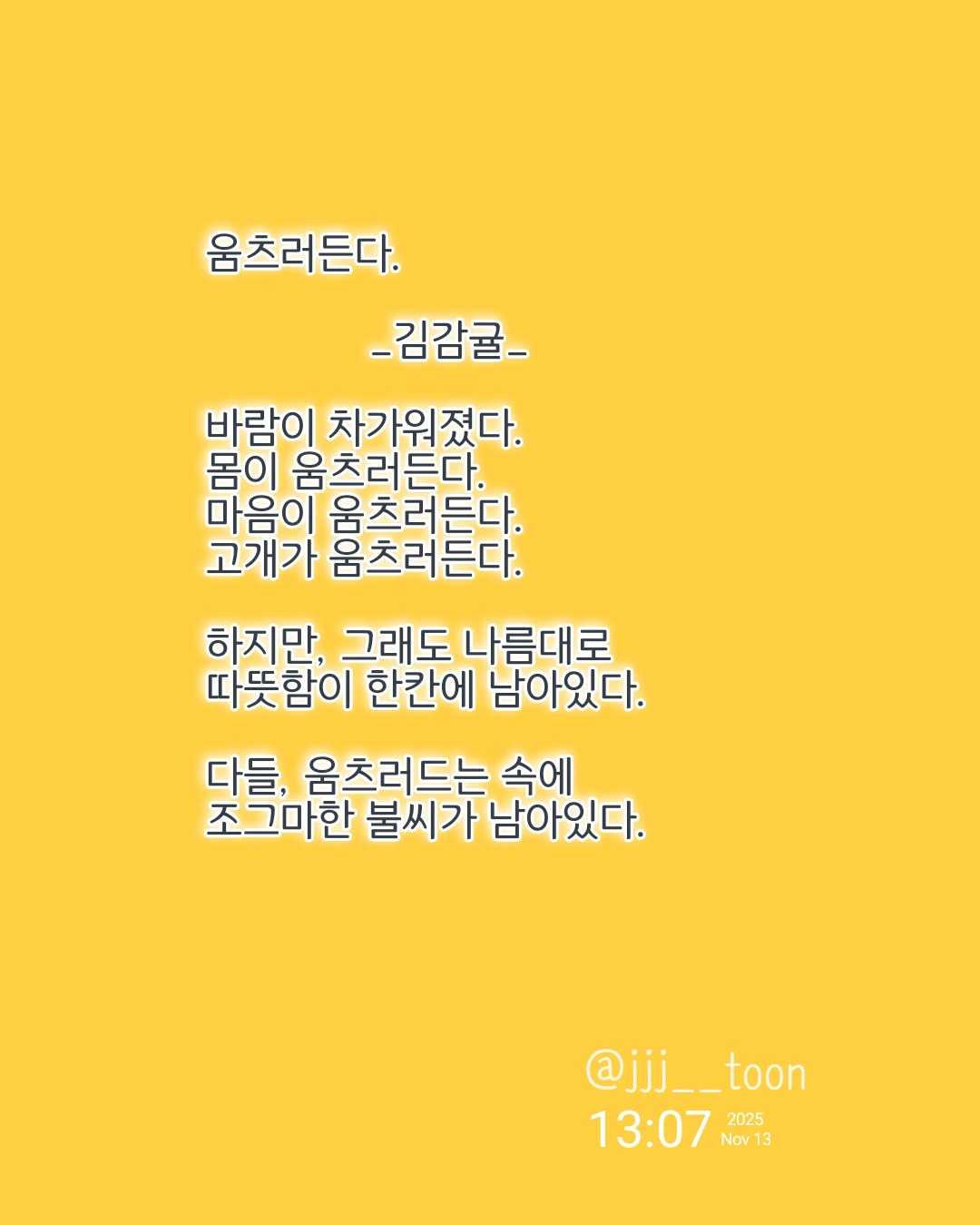 움츠러든다. _김감귤_바람이 차가워졌다.몸이 움츠러든다.마음이 움츠러든다.고개가 움츠러든다.하지만, 그래도 나름대로따뜻함이 한칸에 남아있다.다들, 움츠러드는 속에조그마한 불씨가 남아있다.
