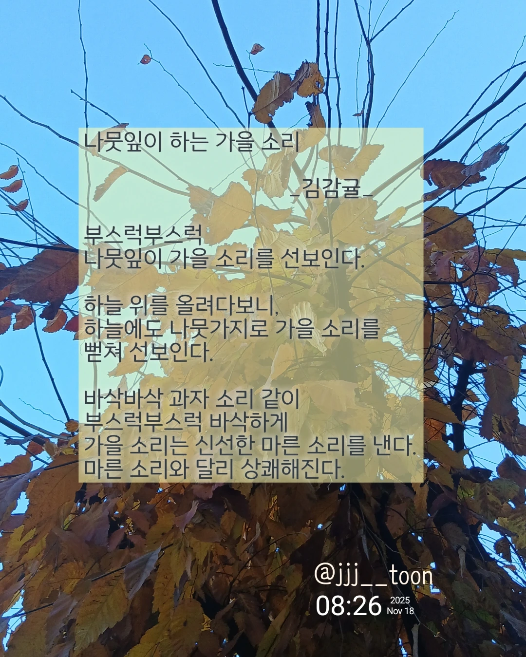 나뭇잎이 하는 가을 소리 _김감귤_부스럭부스럭나뭇잎이 가을 소리를 선보인다.하늘 위를 올려다보니,하늘에도 나뭇가지로 가을 소리를 뻗쳐 선보인다.바삭바삭 과자 소리 같이부스럭부스럭 바삭하게가을 소리는 신선한 마른 소리를 낸다.마른 소리와 달리 상쾌해진다.